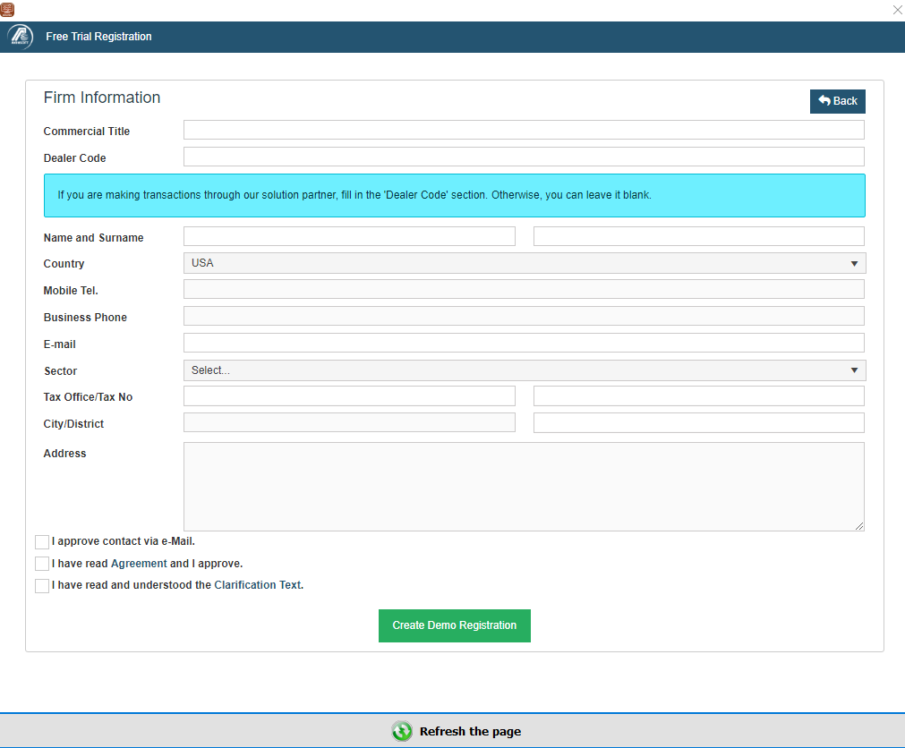 Fill the form with correct and real information, tick the 'User License Agreement' and 'Clarification Text' boxes then press the 'Create Demo Registration' button.