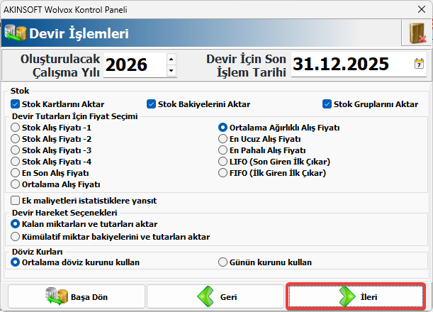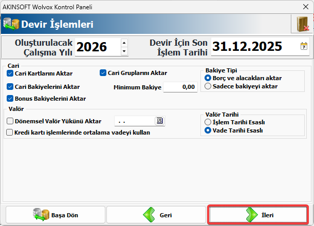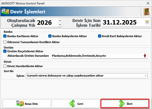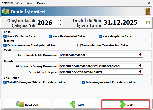 Modül bazında aktarılmasını istediğiniz verileri işaretleyerek ya da aktarılmasını istemediklerinizin işaretini kaldırarak, programınızı yeni yıl için devir işlemine hazır hale getirmiş olursunuz. "İleri" butonuna basarak devir işlemine devam ediniz.