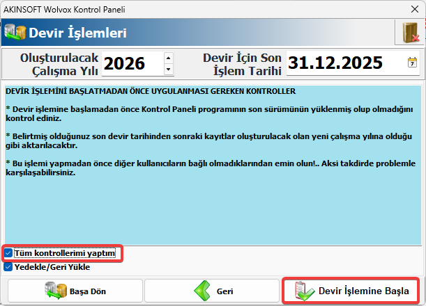 Uyarı 1: Devir işlemi için AKINSOFT WOLVOX Kontrol Panel programınızın sürümünün güncel olması gerekmektedir. Eğer eski bir versiyon kullanıyorsanız; Kontrol Paneli, ERP ve kullanmakta olduğunuz tüm WOLVOX programlarınızı güncellemeniz gerekmektedir. Güncelleme işlemleri için tıklayınız.