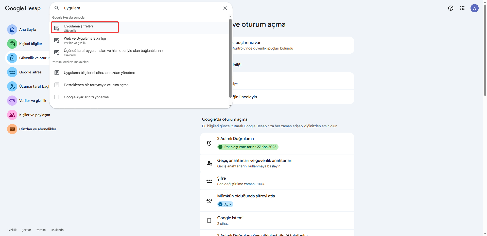 Ardından Uygulama Şifreleri bölümüne girip yeni bir şifre oluşturun.