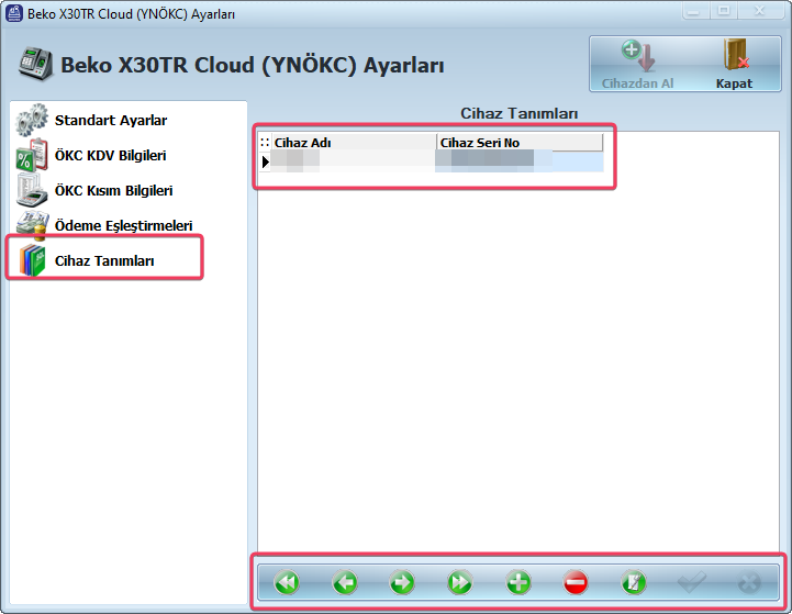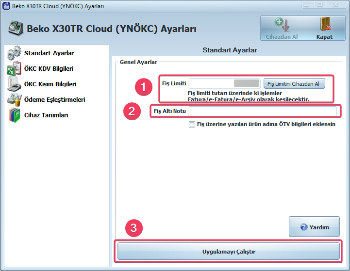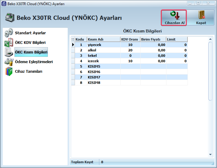 ÖKC Kısım Bilgileri sekmesinden Cihazdan Al butonuna tıklayın. Bu cihazdaki tanımların çekilmesini sağlar. Kısım bilgilerinde yazan limitlere göre satış işlemleriniz etkilenecektir..(Tüm cihazlarda kısım bilgilerinin aynı şekilde tanımlandığından emin olunuz.)