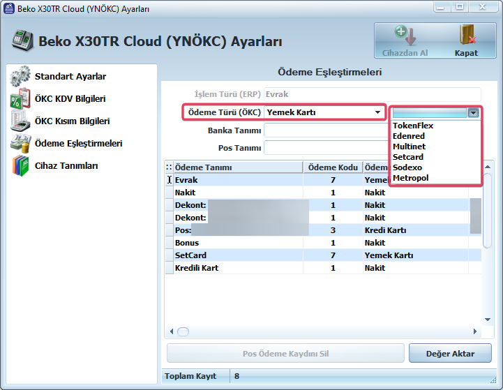 Ödeme Eşleştirmeleri sekmesinde gerekli ödeme eşleştirmelerinizi tamamlayın. Yemek kartları için Yemek Kartı seçeneğini seçtikten sonra cihazda uygulamanın başlatılması için ilgili yemek cihazını seçmeniz gerekmektedir. Uygulamaların cihazda yüklü olması gerekmektedir. Entegrasyonun olduğu firmalar yukarıda resimdeki gibidir.