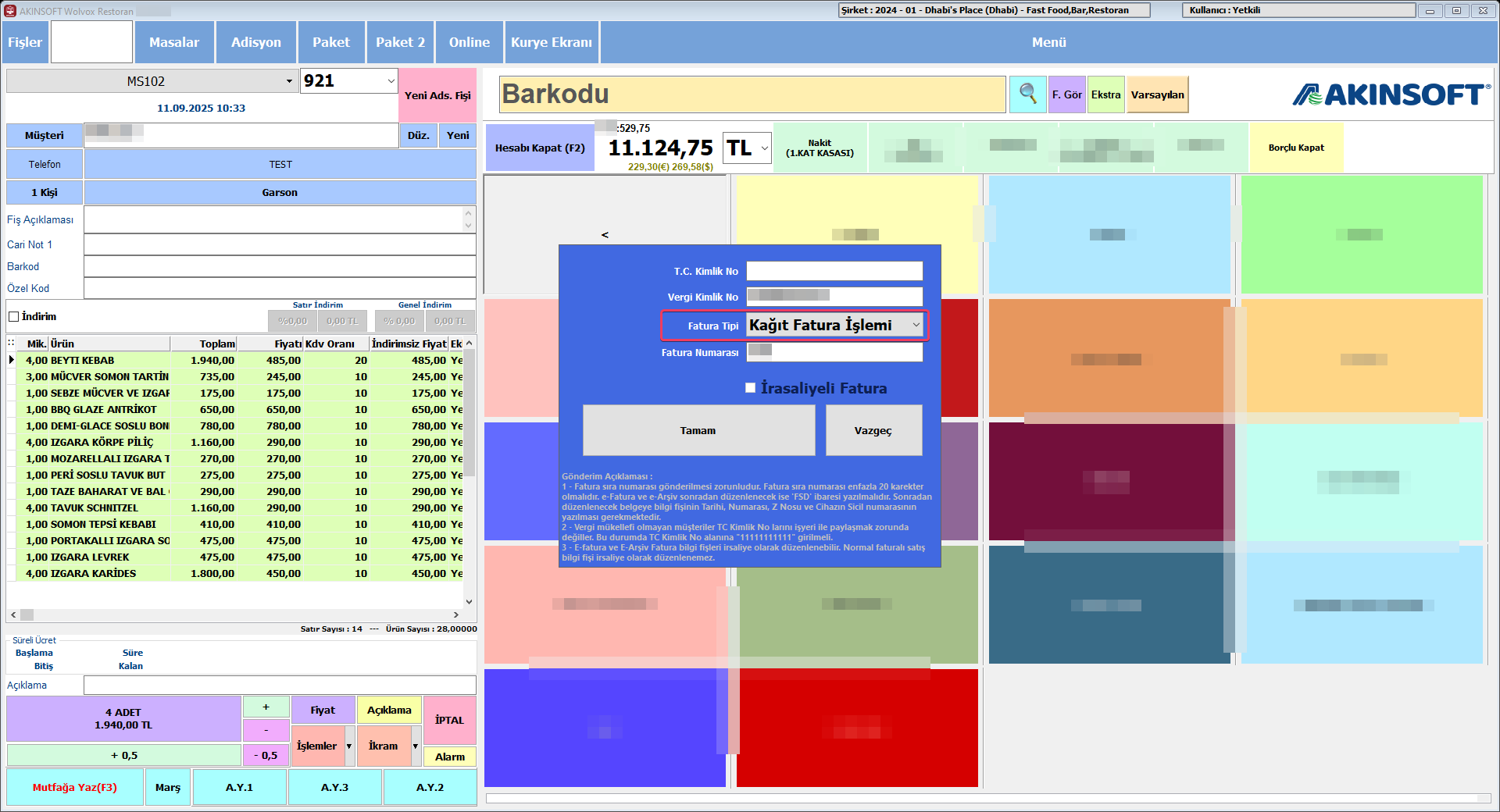 WOLVOX Yazarkasa ayarlarında cihazdan fatura bilgi fişi yazdırmak isterseniz ÖKC Fatura İşlemi seçin ve ödeme işleminizi tamamlayın. Gelen ekrandan fatura bilgilerini girin ve Tamam butonuna tıklayın. Bu işlem size Fatura Bilgi Fişi çıkarılmasını sağlayacaktır.
