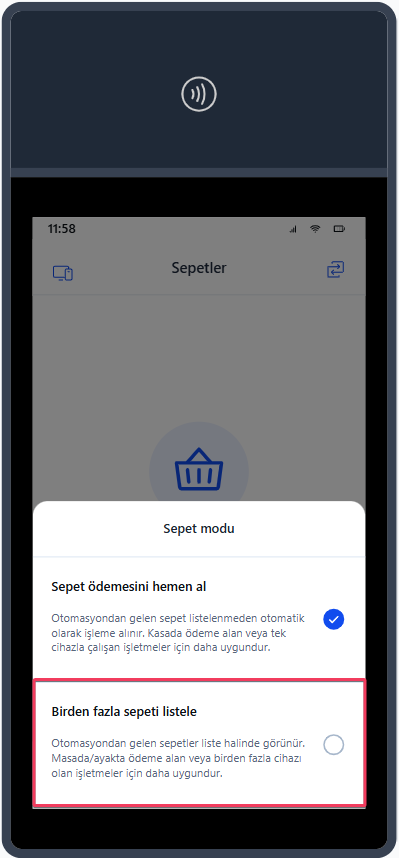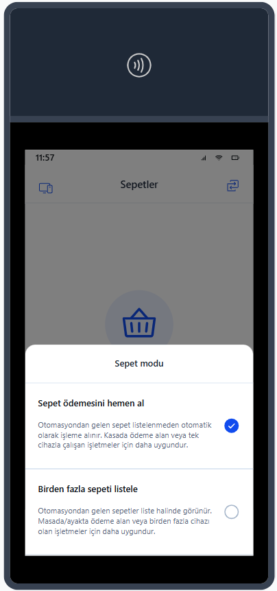 Cihazınızı ilk açtığınızda "Sepet ödemesini hemen al" modu ile karşılaşırsınız. Bu sepet modu ödemenin hemen alınacağı durumlarda kullanılır. Bu uygulama tipini kullanabilmek için TokenX Connect uygulaması "Sepet ödemesini hemen al" modunda olmalıdır. Ödemesi alınan sepet otomatik olarak kapatılacaktır. Bu modu sağ üstte bulunan ikona tıklayarak seçebilirsiniz.