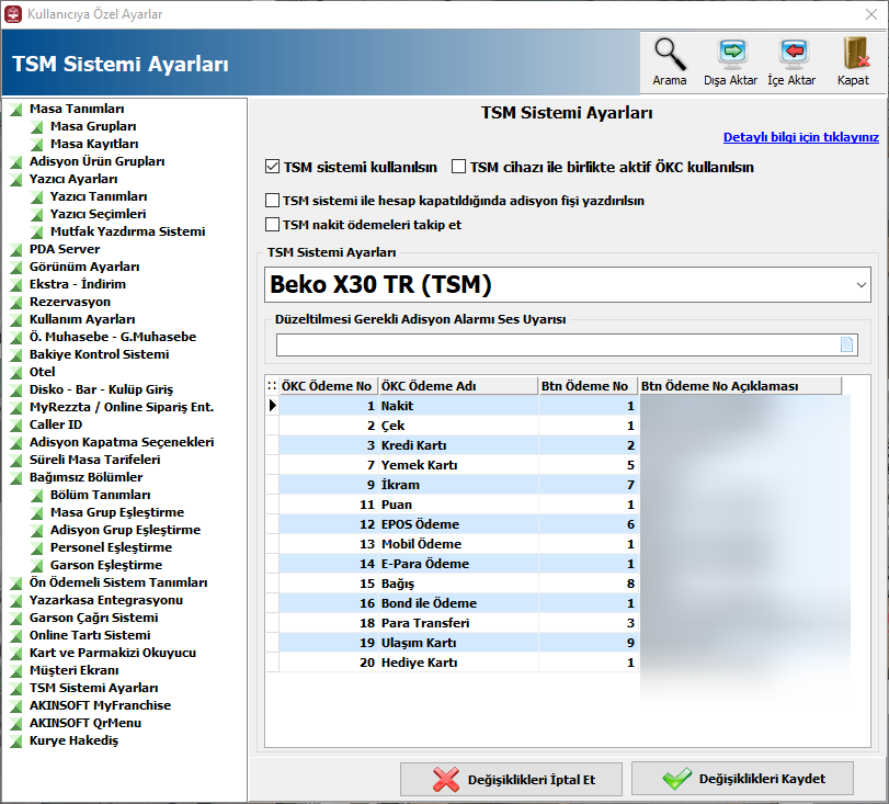 Beko X30 TR ‘Sepet ödemesini hemen al’ entegrasyonu kullanabilmeniz için lisansınızda Yazarkasa modülünün olması gerekmektedir. Restoran program sürümünün minimum 9.03.13 ve Yazarkasa program sürümünün minimum 9.03.04 olması gerekmektedir. Bu modeli eğer 21 Nisan 2026 sonrasında veya Restoran program sürümü 26.03.01 ve yazarkasa program sürümü 26.04.01 üzerinde kullanıyorsanız, aşağıdaki bilgileri ticket kaydı üzerinden AKINSOFT teknik destek ekibine iletmeniz gerekmektedir.