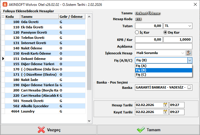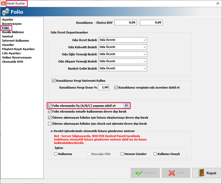Kullanımını sağlamak için Yekili-Genel Ayarlar-Folio ekranından Fiş (A/B/C) yapısını aktif et ayarını işaretlemeniz gerekmektedir.