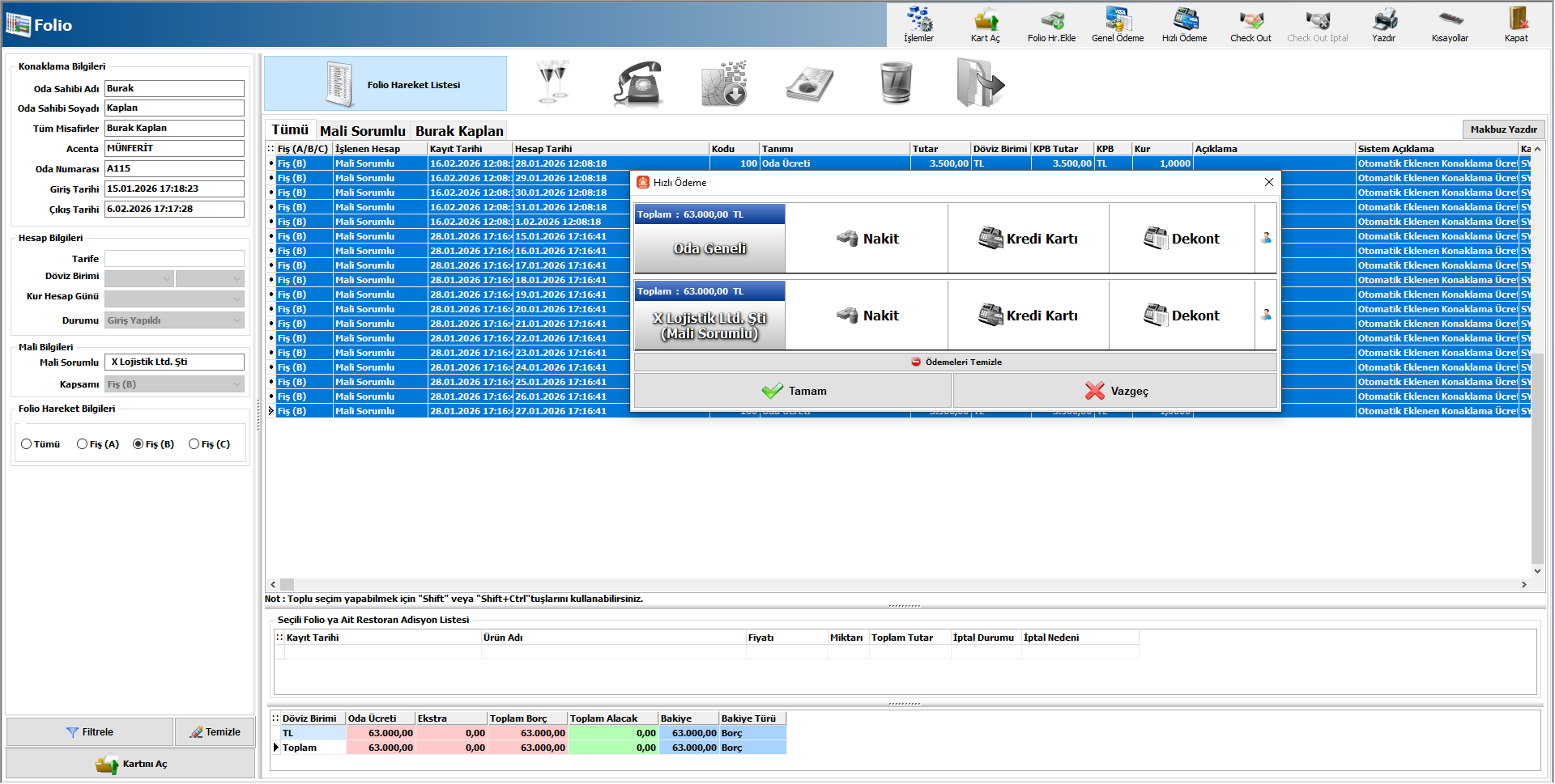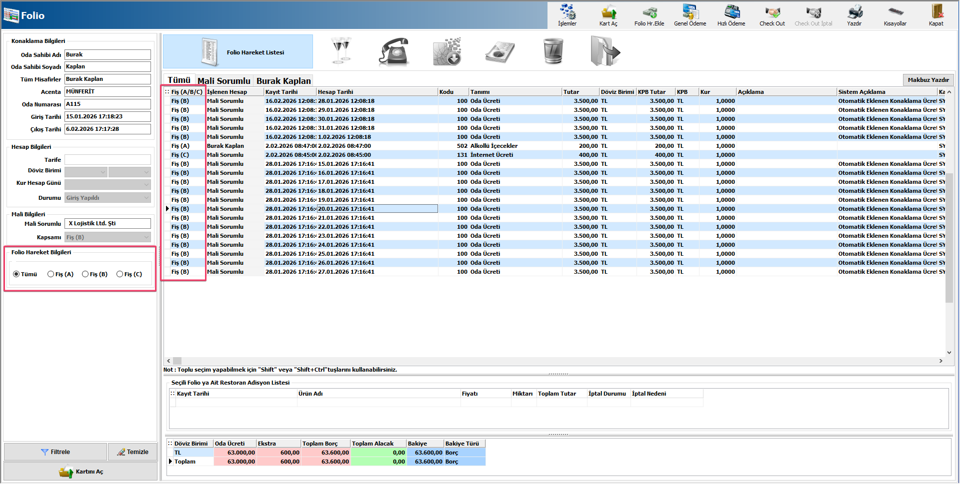 Herhangi bir Fiş (A/B/C) içerisindeki gelir türüne çift tıklarsanız, Folio Hareketler Listesi ekranına ilgili fiş yapısına ait hareketler seçilmiş bir şekilde gelecektir. Örneğin Fiş (B) içerisindeki bir gelir türüne tıklayalım. Gelen ekrandan seçili folio hareketleri için ödeme alabilir ve faturalandırma işlemini sağlayabilirsiniz. Böylelikle Fiş (A/B/C) yapısı üzerinde yazdırma,ödeme ve faturalandırma yapabilirsiniz.