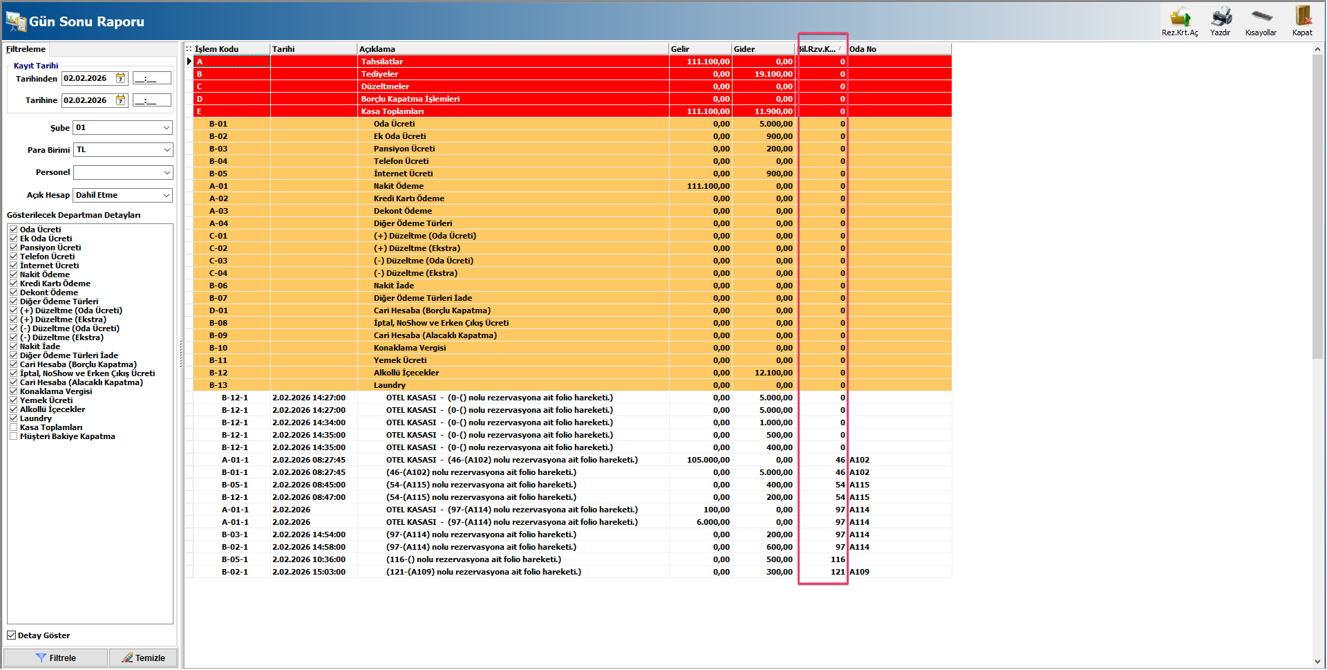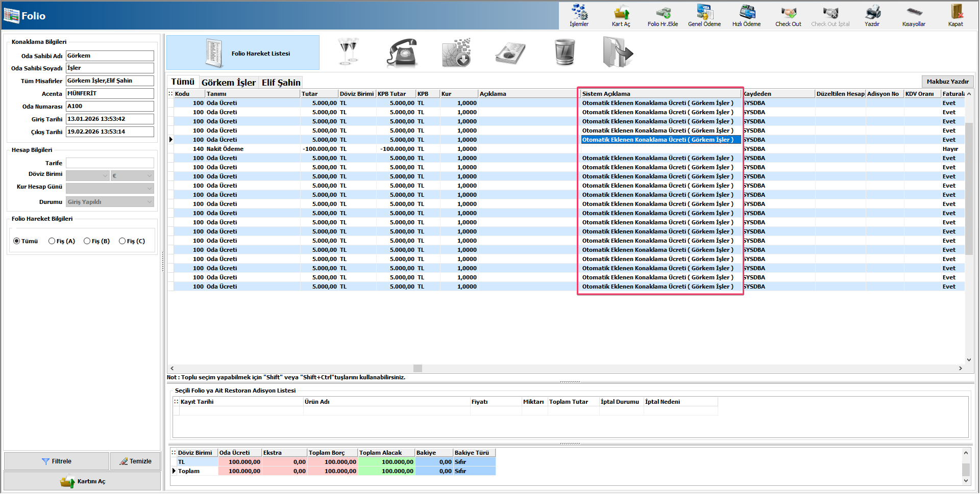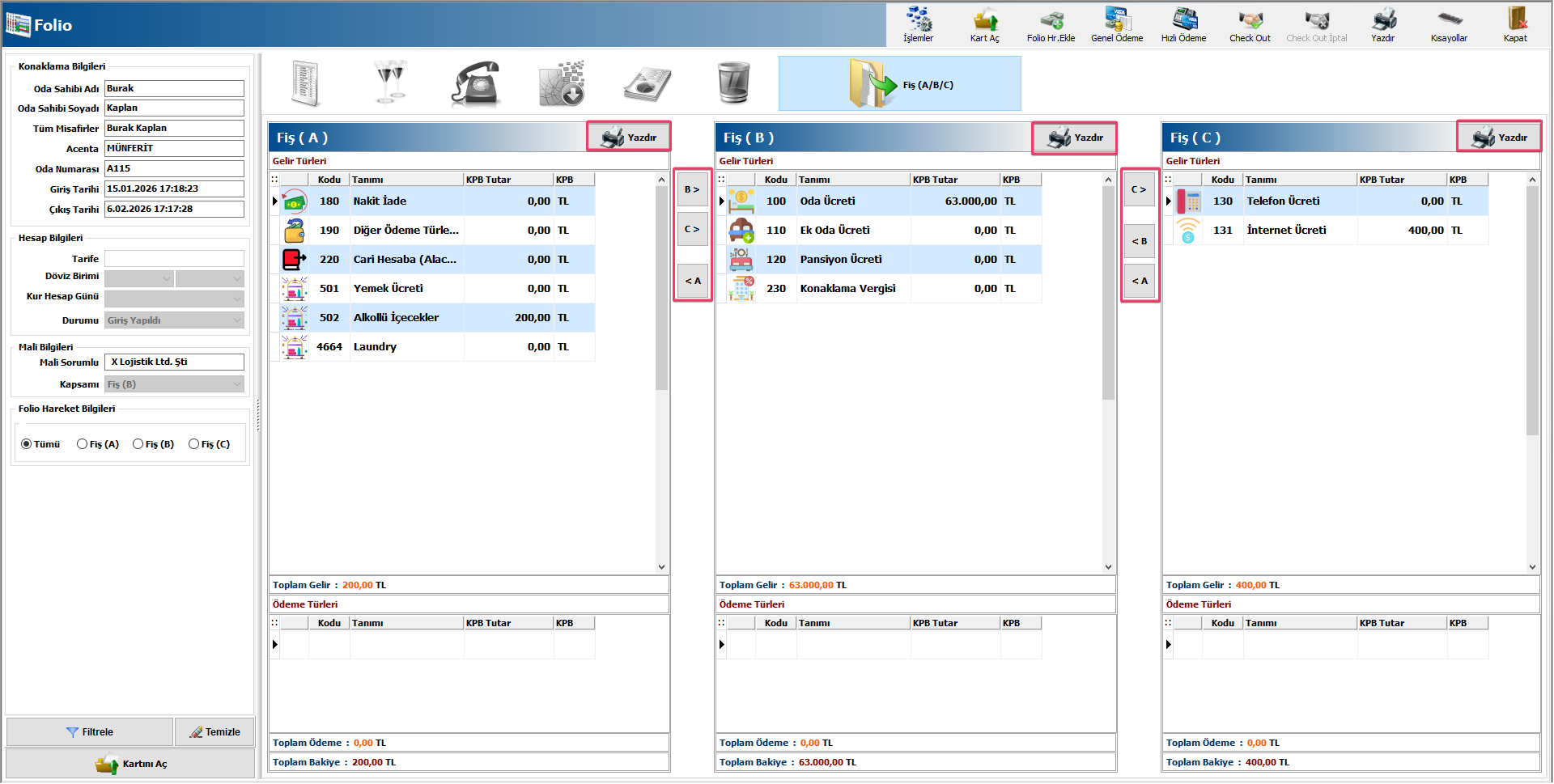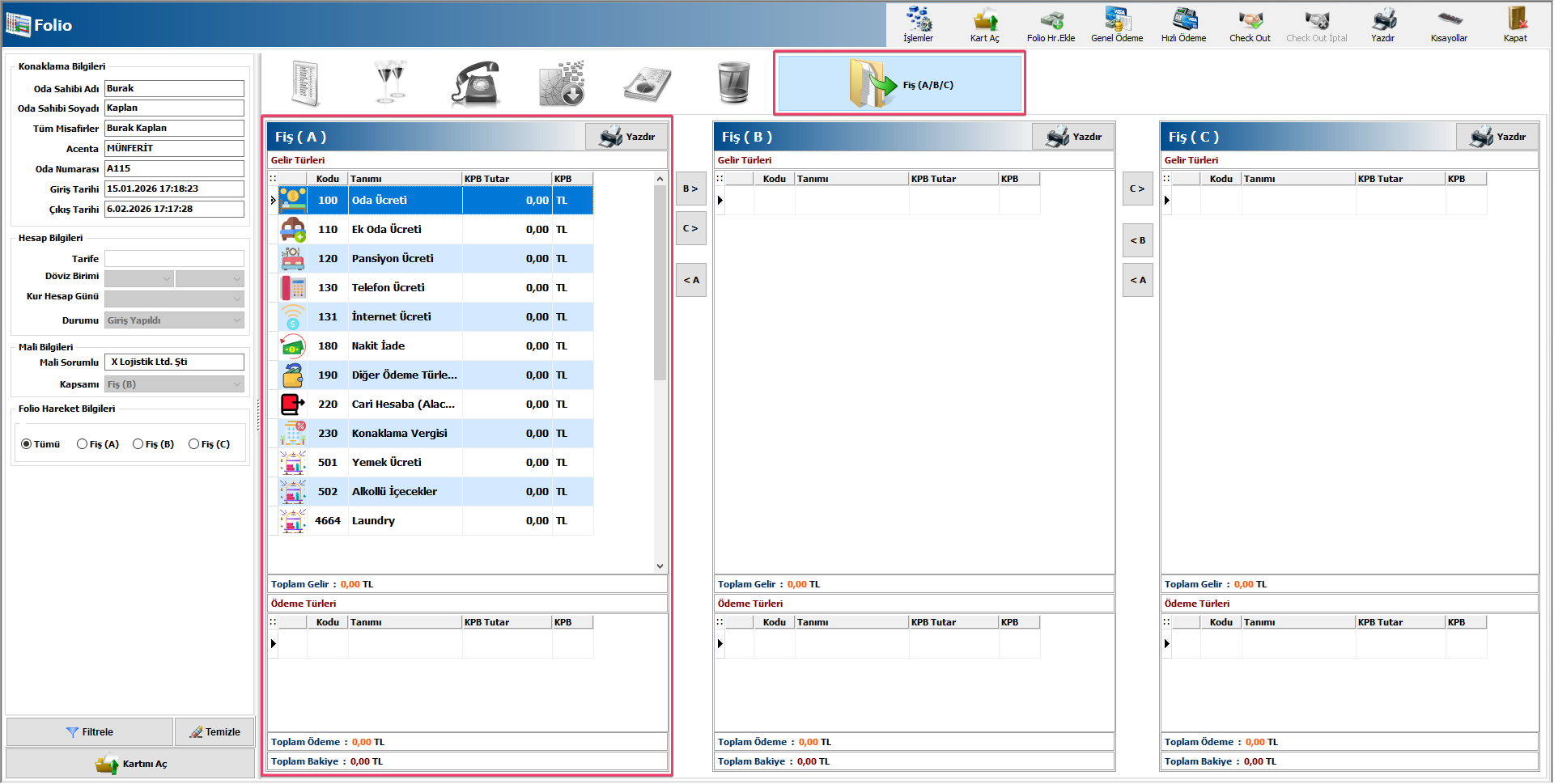 Folio ekranında gelir türlerini tekli veya çoklu olarak sütunlar arasında A,B ve C butonlarıyla sağlayabilirsiniz.