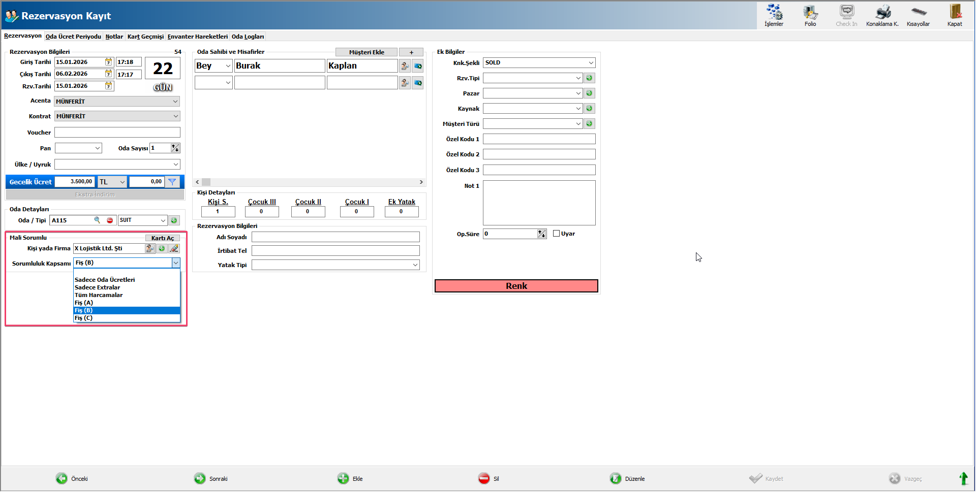 Rezervasyon Kayıt ekranında Sorumluluk kapsamı alanına Fiş A,B ve C seçimi sağlanabilir.
