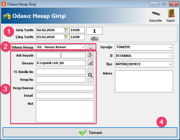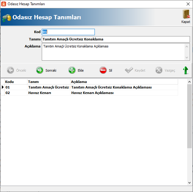 Odasız Hesap yapısı eklenerek, oda tanımından bağımsız bir şekilde rezervasyon ve folio oluşturup oda haricinde gelir ve gider takibi yapılmasını sağlanmıştır. Öncelikle Yetkili-Oda Tanımları-Odasız Hesap Tanımları ekranından tanımları eklemeniz gerekmektedir.