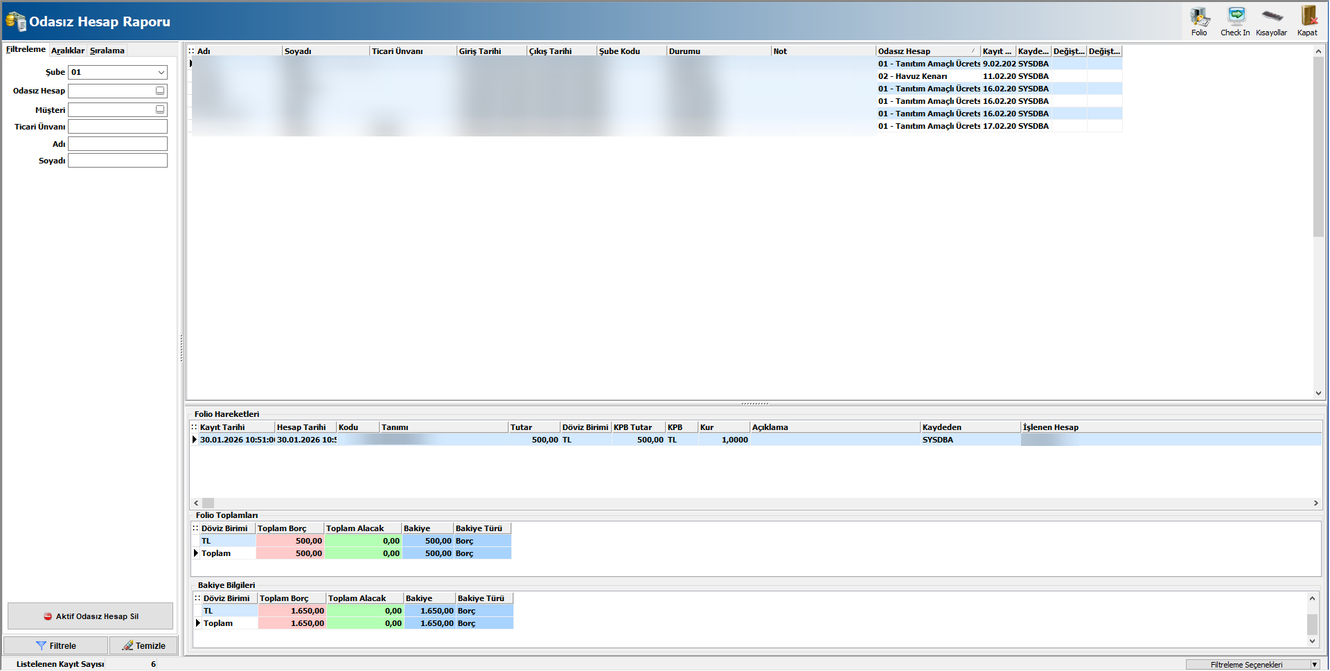 Girdiğiniz kayıtların raporlarını Ön Kasa-Raporlar-Odasız Hesap Raporu ekranından görebilirsiniz.Rapor ekranından odasız hesaba ilişkin Check In butonu ile check in işlemini yapabilir ve sonrasında Folio butonu ile de folioyu açıp gelir ve gider ekleyebilirsiniz.
