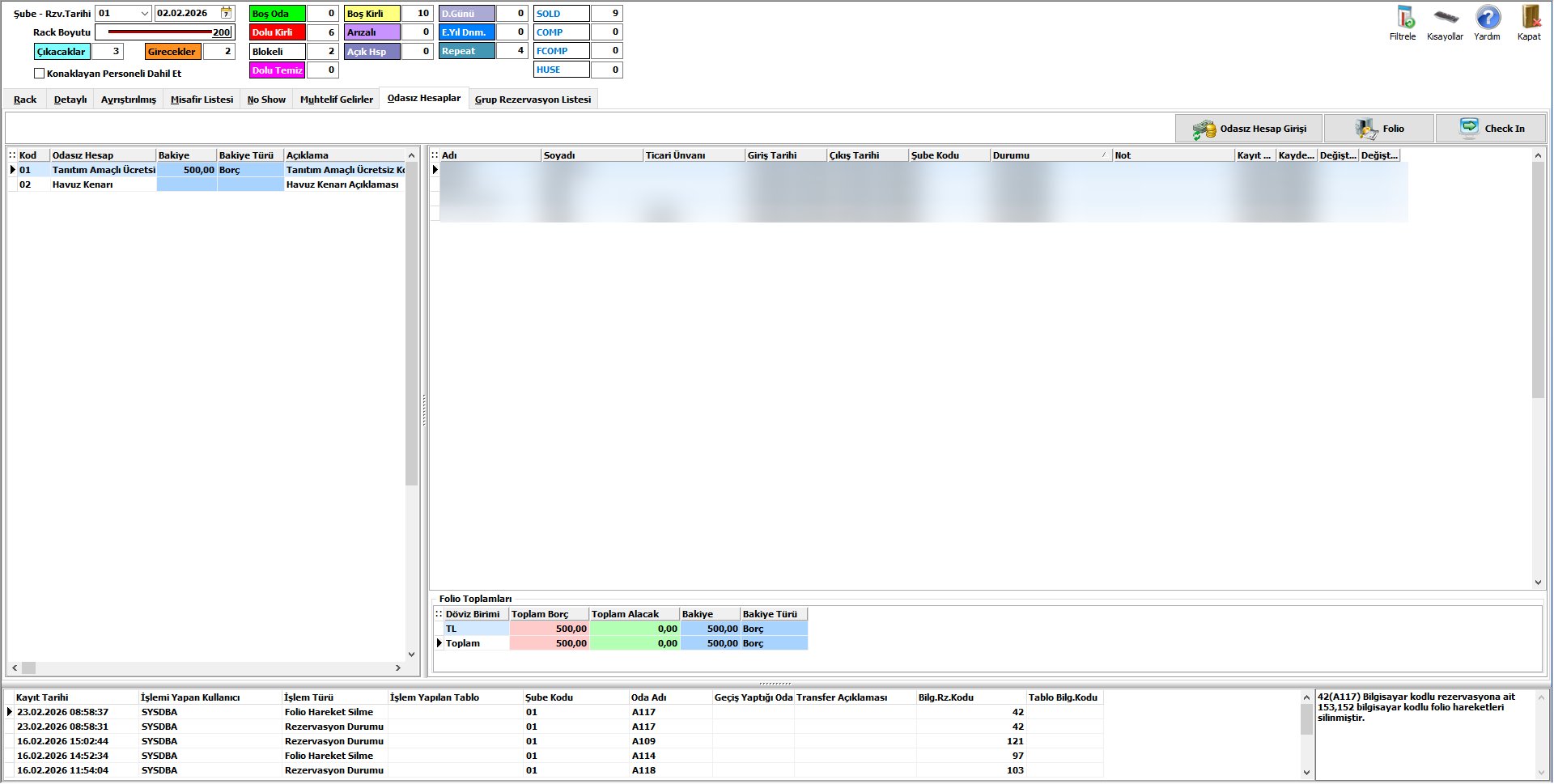 Rack Ekranı üzerinde Odasız Hesaplar tanım ve girişlerin hakkında seçilen güne ilişkin rapor alabilirsiniz. Bu ekrandan Odasız Hesap Girişi, Check In ve Folio açma işlemlerini sağlayabilirsiniz.