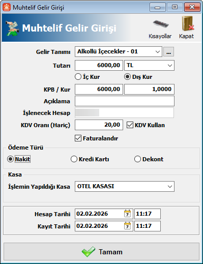 Hesap ve Kayıt Tarihi: İşleme ait kayıt tarihi belirtebilir ve hesap işleme tarihi seçilebilir.