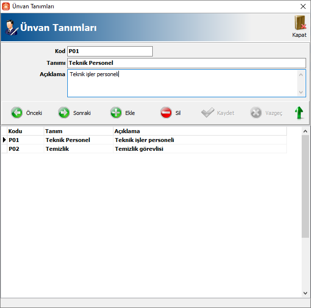 Yetkili-Diğer Tanımlamalar-Ünvan Tanımları ekranından personel ünvanlarını kayıt edebilirsiniz.