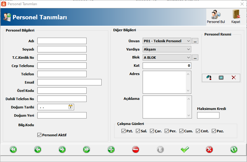 Çalışma Günleri: Personelin çalıştığı günlerin seçildiği alandır.