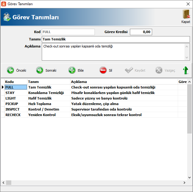 Bu ekranda varsayılan olarak gelen tanımlar bulunmaktadır. Dilerseniz kendi tanımlarınızı da girebilirsiniz. Personellerdeki kredi sistemini kullanmak istiyorsanız görevlere de kredi vermeniz gerekmektedir.