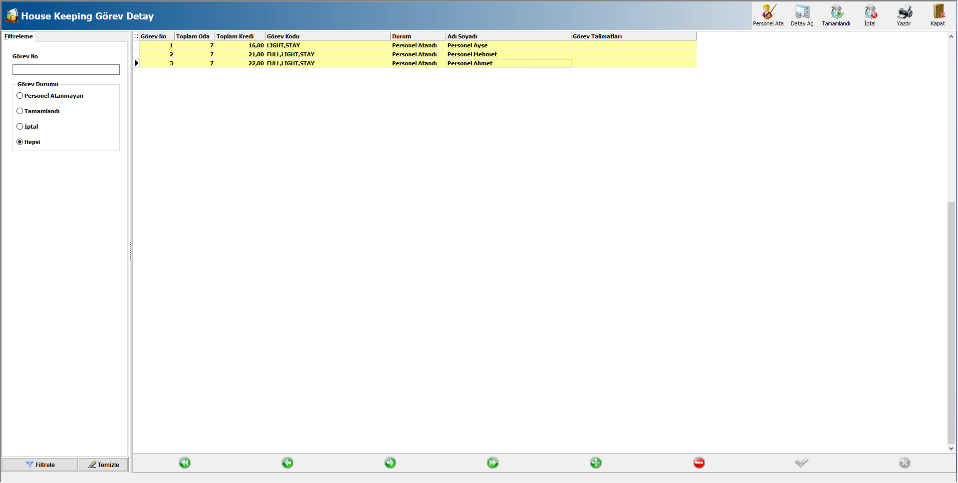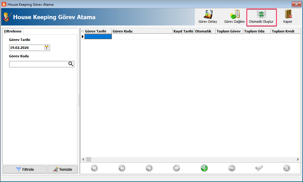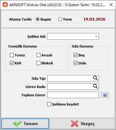 Toplam Görev: Seçilen kriterlere uygun olan odaların kaç personele atanacağını ifade eder. Örneğin, seçtiğiniz kriterleri sağlayan 30 adet oda varsa, Toplam Görev alanında 3 girilmesi halinde 30 oda 3 eşit parçaya bölünür. Açılacak ekrandan bu 3 parçaya farklı personel ataması sağlanabilir.