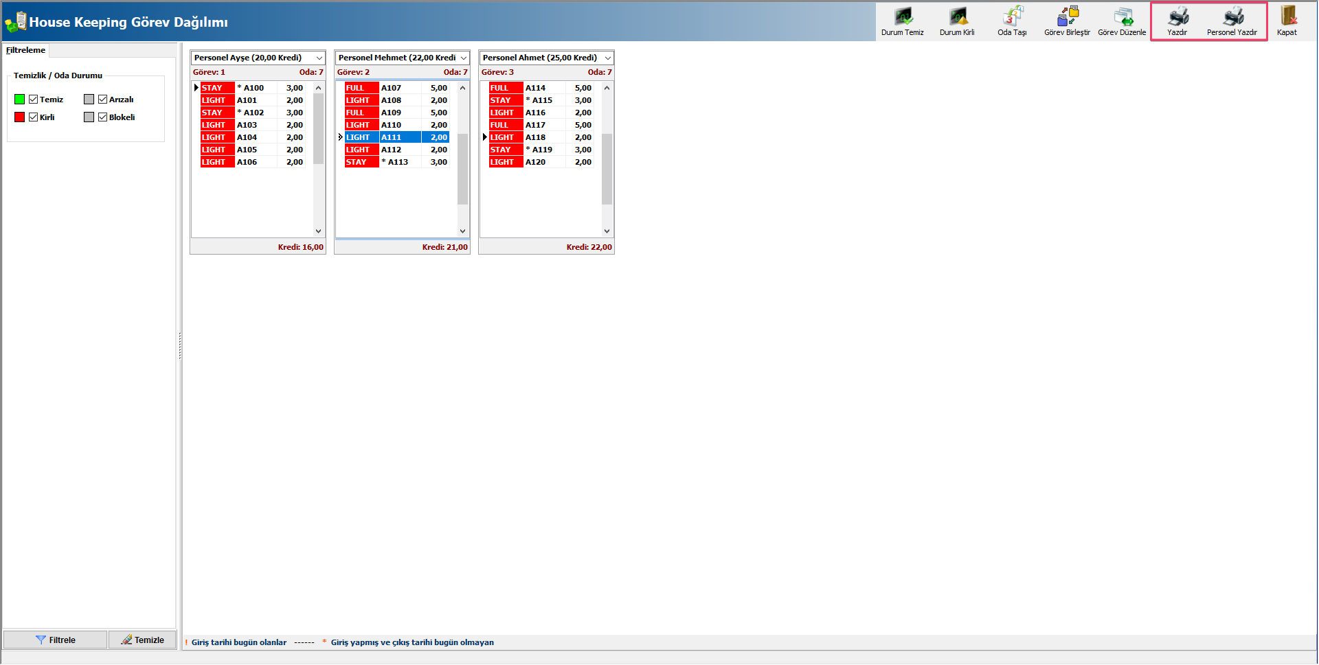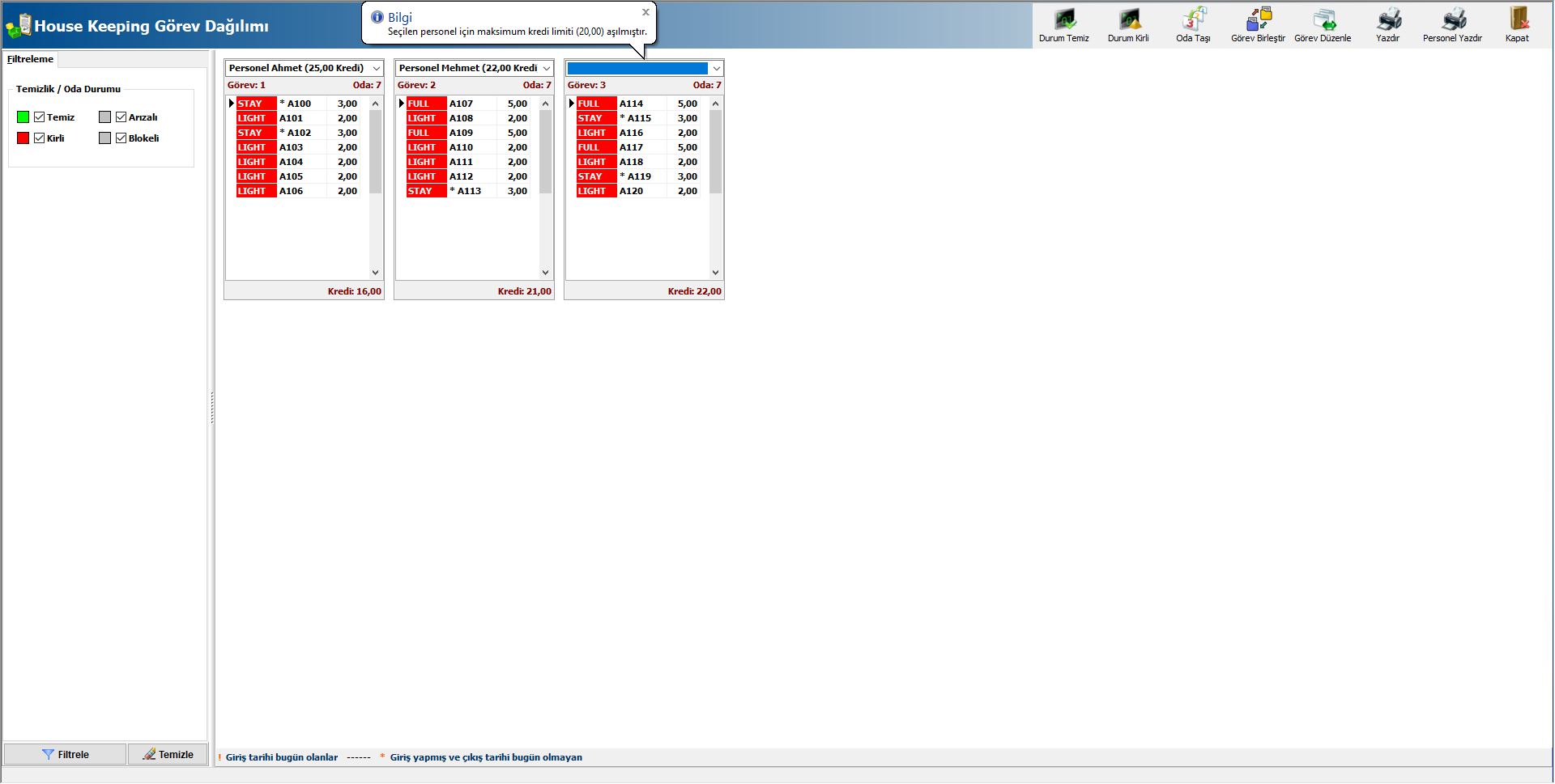 Açılan ekrandan eşit bölünen görev slotları üzerinde personel seçimi yapabilirsiniz. Oluşturulan bu görevde oda rezervasyon durumu baz alınarak (Check in, stayover, check out vb.) karşılarına uygun görev tanımları gelmektedir. Giriş tarihi bugün olan odaları ! işareti ile, stayover olan rezervasyonu bulunan odaları ise * ile görüntüleyebilirsiniz. Odalar üzerindeki renk durumu odanın temiz, kirli, arızal veya blokeli olduğunu göstermektedir. ıBu ekrandan;