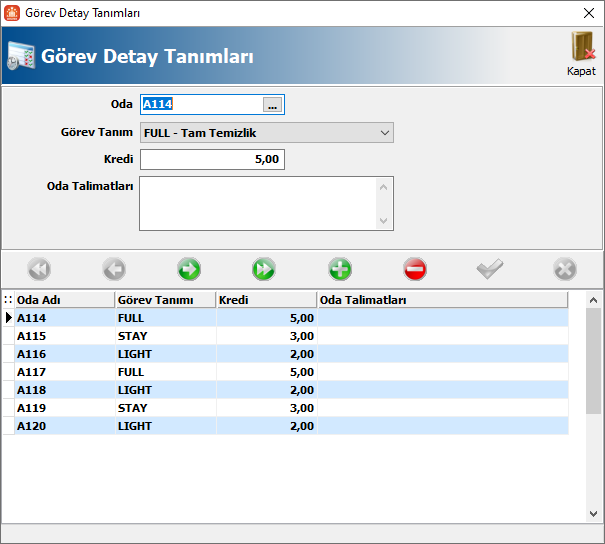 Detay Aç butonu ile oda numarası, görev tanımı, kredi bilgisi değiştirilebilir ve oda talimatları bilgisi girilebilir.