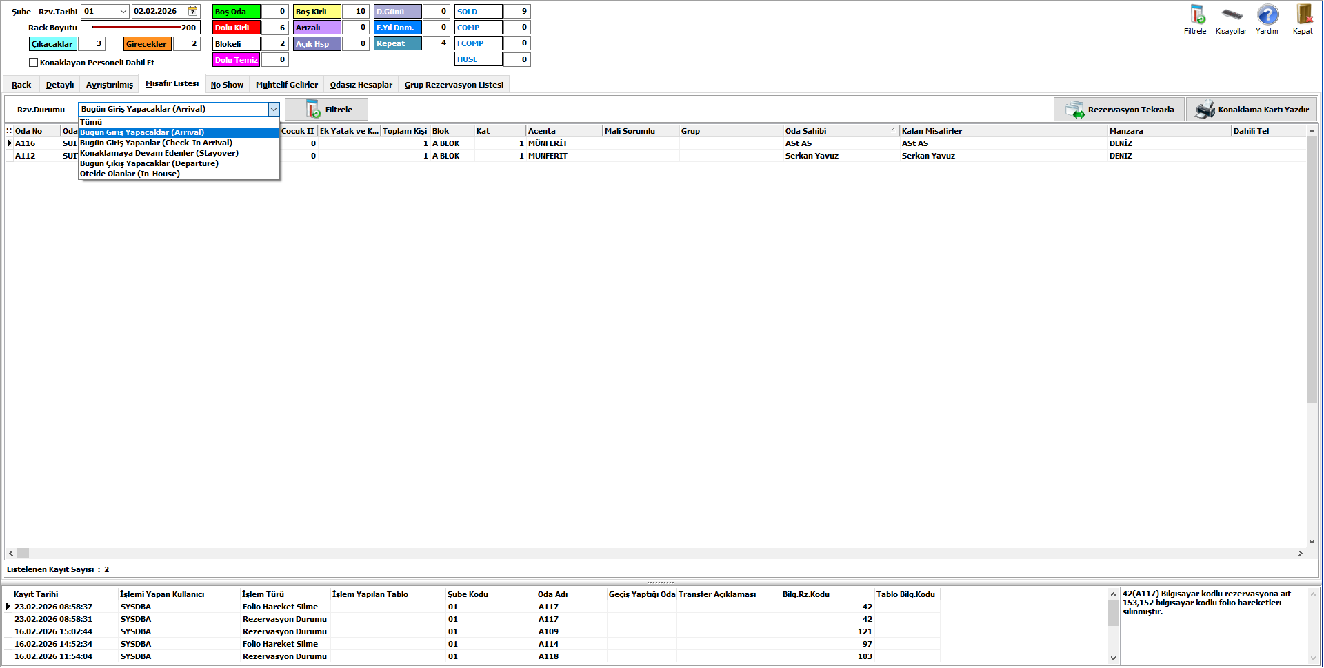Rack ekranının kullanımını artırmak için, Misafir Listesi, NoShow, Muhtelif Gelirler, Odasız Hesaplar ve Grup Rezervasyon Listesi sekmeleri eklendi. Eklenen bu sekmelerin varsayılan olarak günün tarihine göre getirilmesi ve sadece bu sekmeler özelinde değiştirilebilmesi sağlandı. Ayrıca, rack ekranındaki tüm sekmelerde geçerli olacak şekilde rezervasyon ve folioda yapılan son 5 işlem logunun getirildiği alan eklenmiştir.