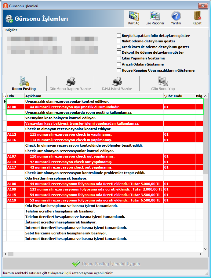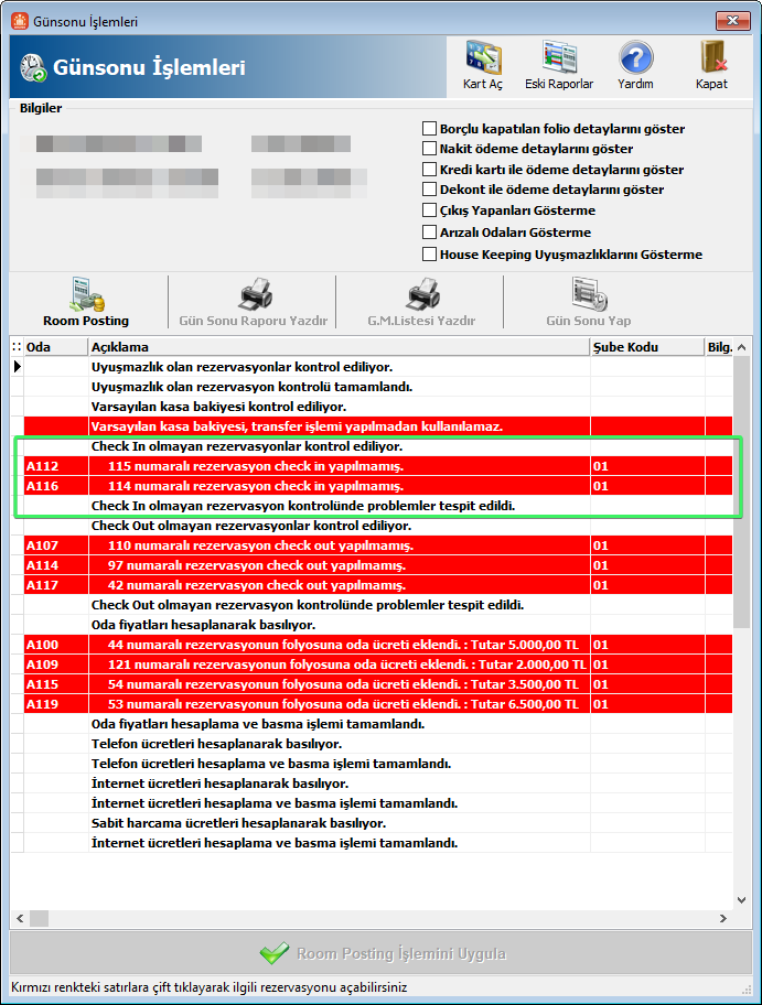 Günsonu İşlemleri ekranına oteldeki operasyonları ve kontrolleri kolaylaştırabilmek için birkaç kontrol eklendi. Günsonu işlemleri sayfasında aşağıdaki işlemler kontrol edilir ve bu işlemler de sorun olması durumuda Room Posting Uygula, Gün Sonu Yap, Gün Sonu Raporu Yazdır ve G.M.Listesi Yazdır butonları pasif olmaktadır.