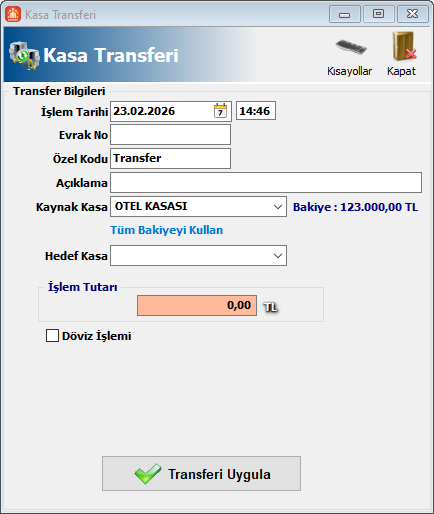 Transfer işlemini hızlı bir şekilde yapabilmeniz için Kasa Transferi ekranında Kaynak Kasa alanına genel ayarlardaki varsayılan kasa bilgisinin getirilmesi ve bakiyenin kolaylıkla aktarılması için buton eklendi.