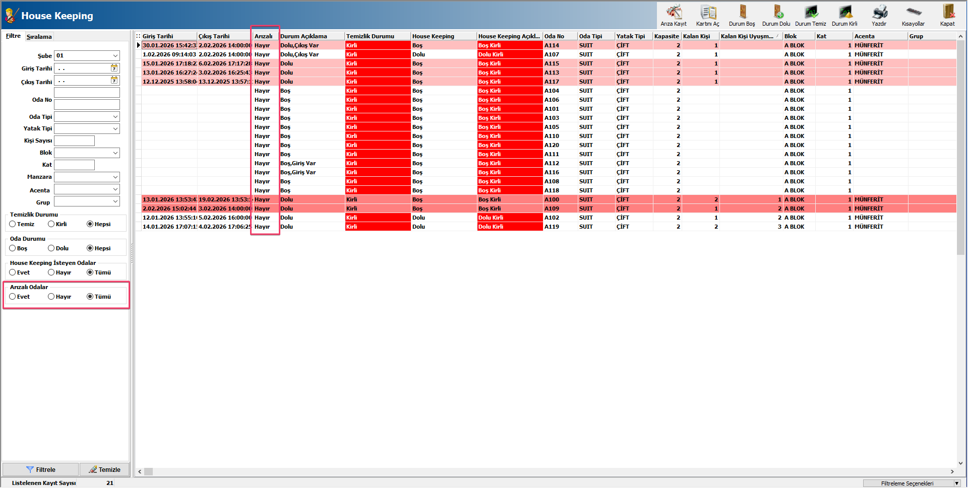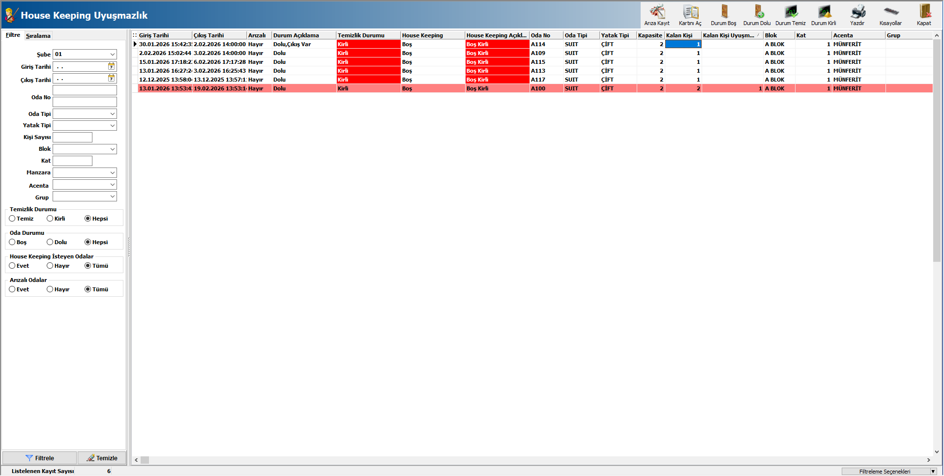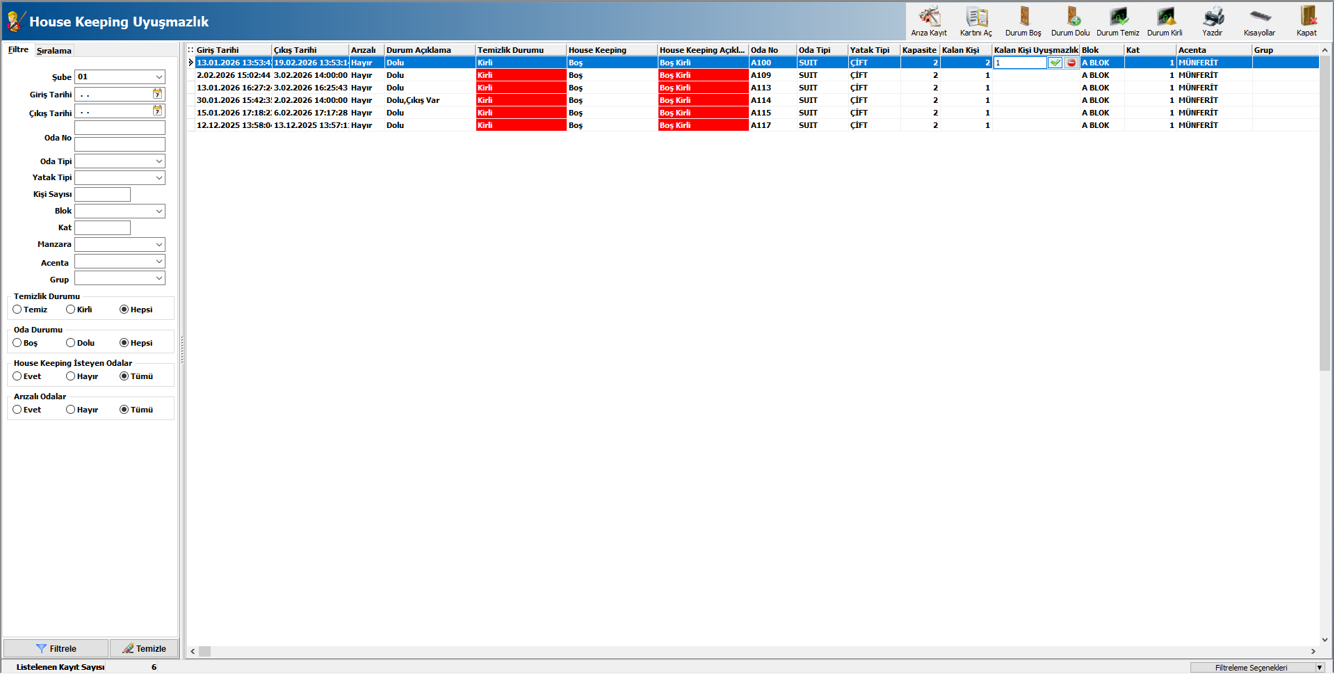Durum Temiz ve Durum Kirli butonlarıyla, oda housekeeping durumunu temiz veya kirliye alabilir,