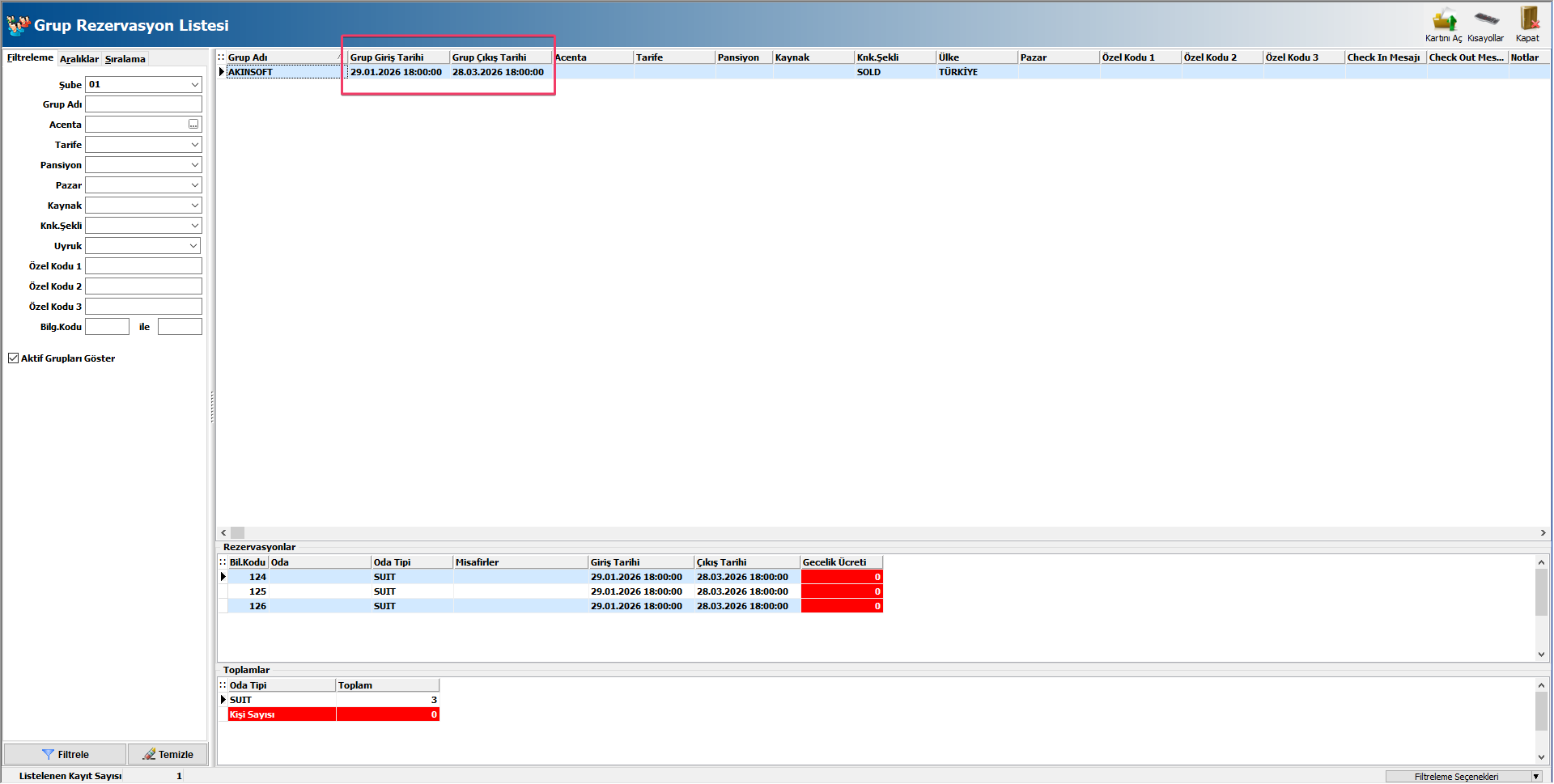 Varsayılan olarak, günün tarihine göre çalışır ve alt filtreleme alanında bugün giriş yapacak misafirleri listeler. Dilerseniz tarih bölümünü ve alt rezervasyon alanından istediğiniz durumu seçebilirsiniz. Bu ekrandan;