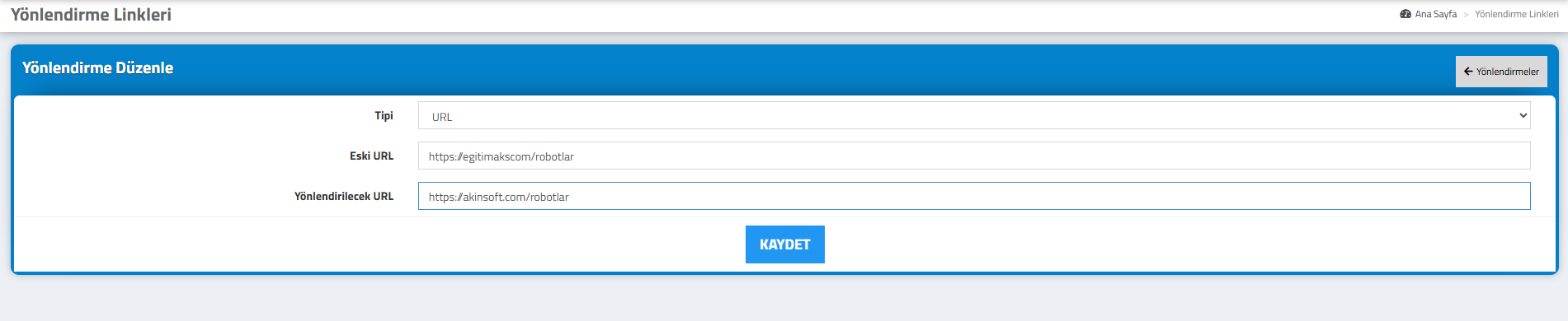 Bu işlem için Diğer menüsünde bulunan URL Yönlendirmeleri >> "Yönlendirme Linkleri" alanından faydalanabilirsiniz.