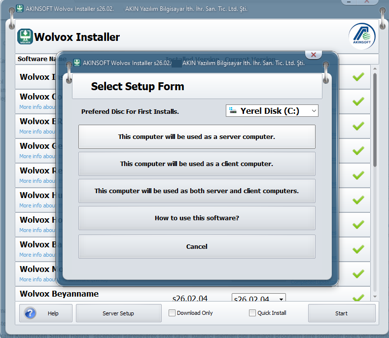 AKINSOFT Wolvox Installer program is used to automatically download Wolvox group programs from the Internet and easily install them on server or client computers.