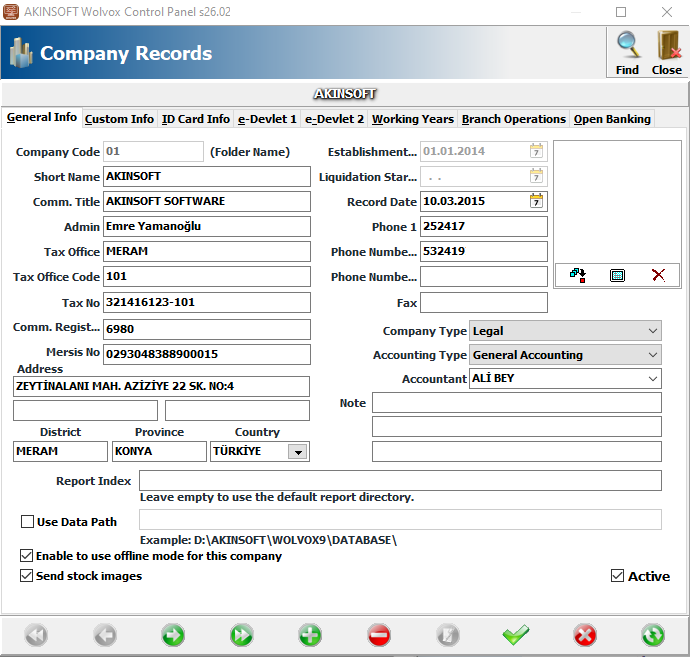 To register your companies, go to the "Company Record" section from the "Admin" menu. After entering the required information, click the "Save" button. Then go to the "Working Years" tab and click "Create Working Year (F8)". Enter the working year and click "Create Working Year".
