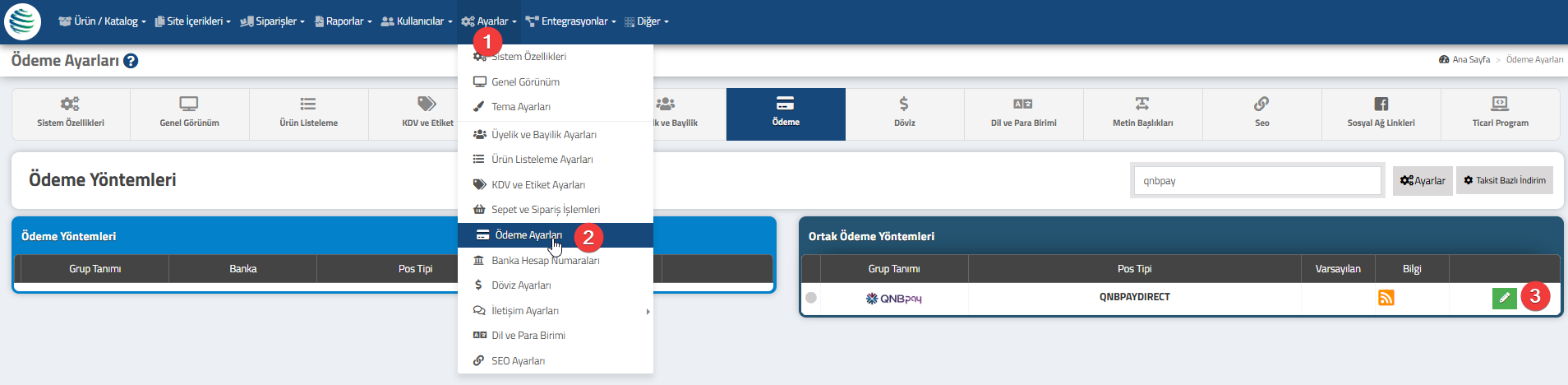 1. Adım Akınsoft e-Ticaret panelinizden Ayarlar > Ödeme Ayarları sayfasına gelerek ; QNB Pay satırında bulunan düzenleme butonuna tıklayın.