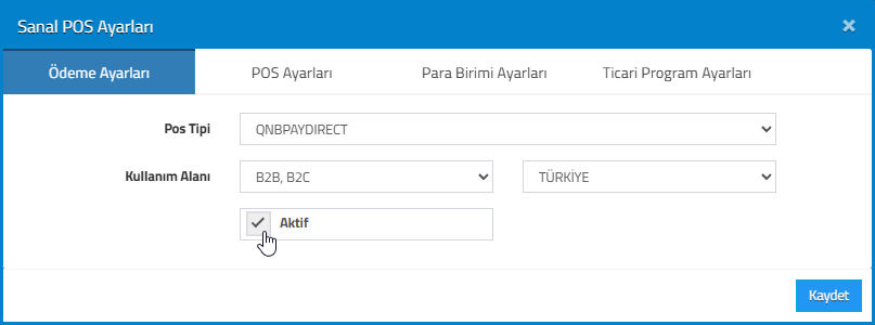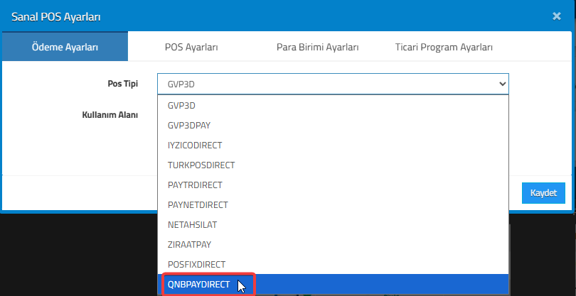 2. Adım Açılan penceredeki Ödeme Ayarları yardımı ile pos tipinizi(QNB Pay) ve kullanım alanlarınızı belirleyiniz.