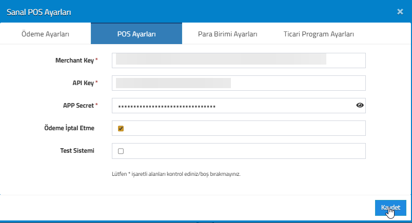 3. Adım Pos Ayarları alanına gelerek QNB Pay ekibi tarafından size iletilen bilgileri ilgili alanlara yazmanız gereklidir.