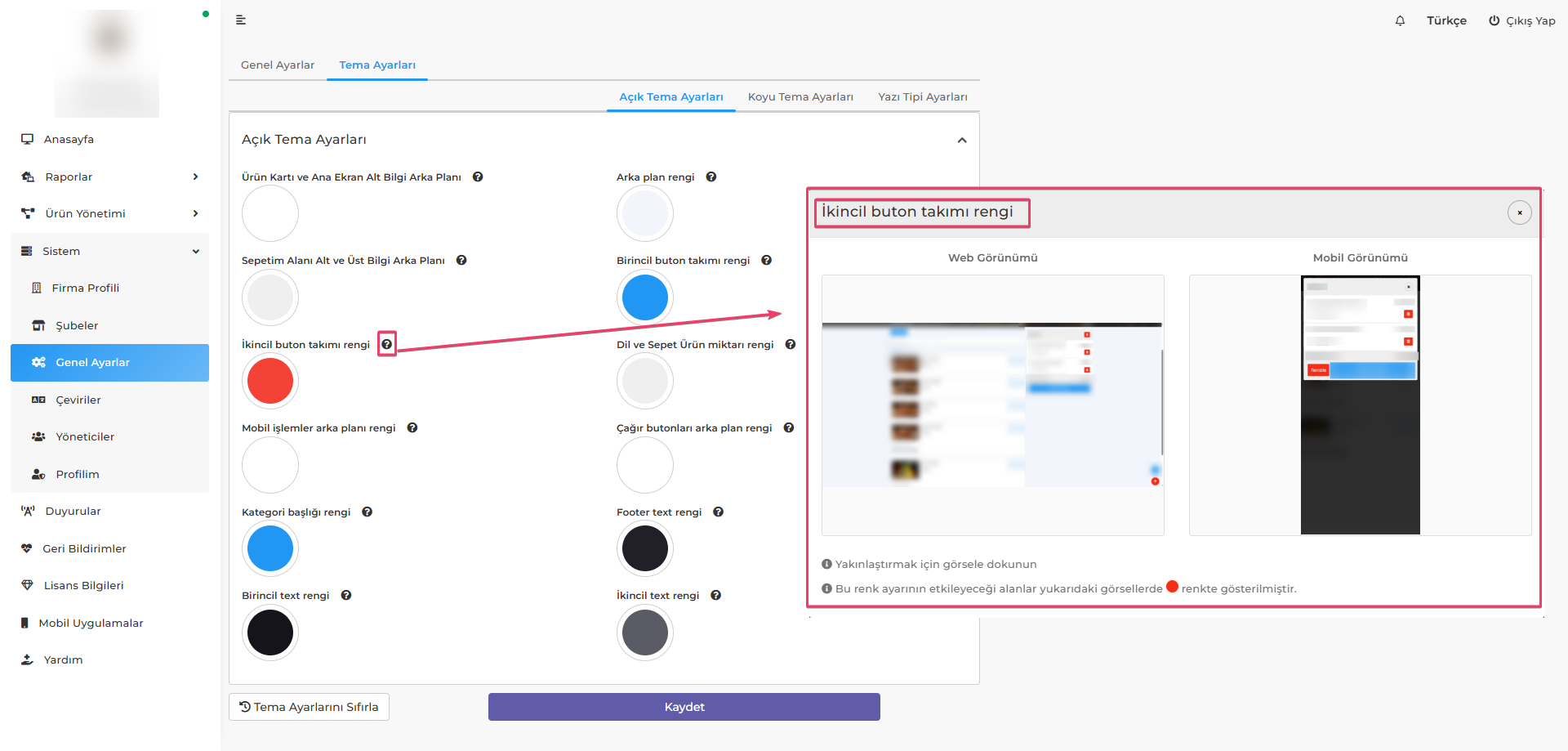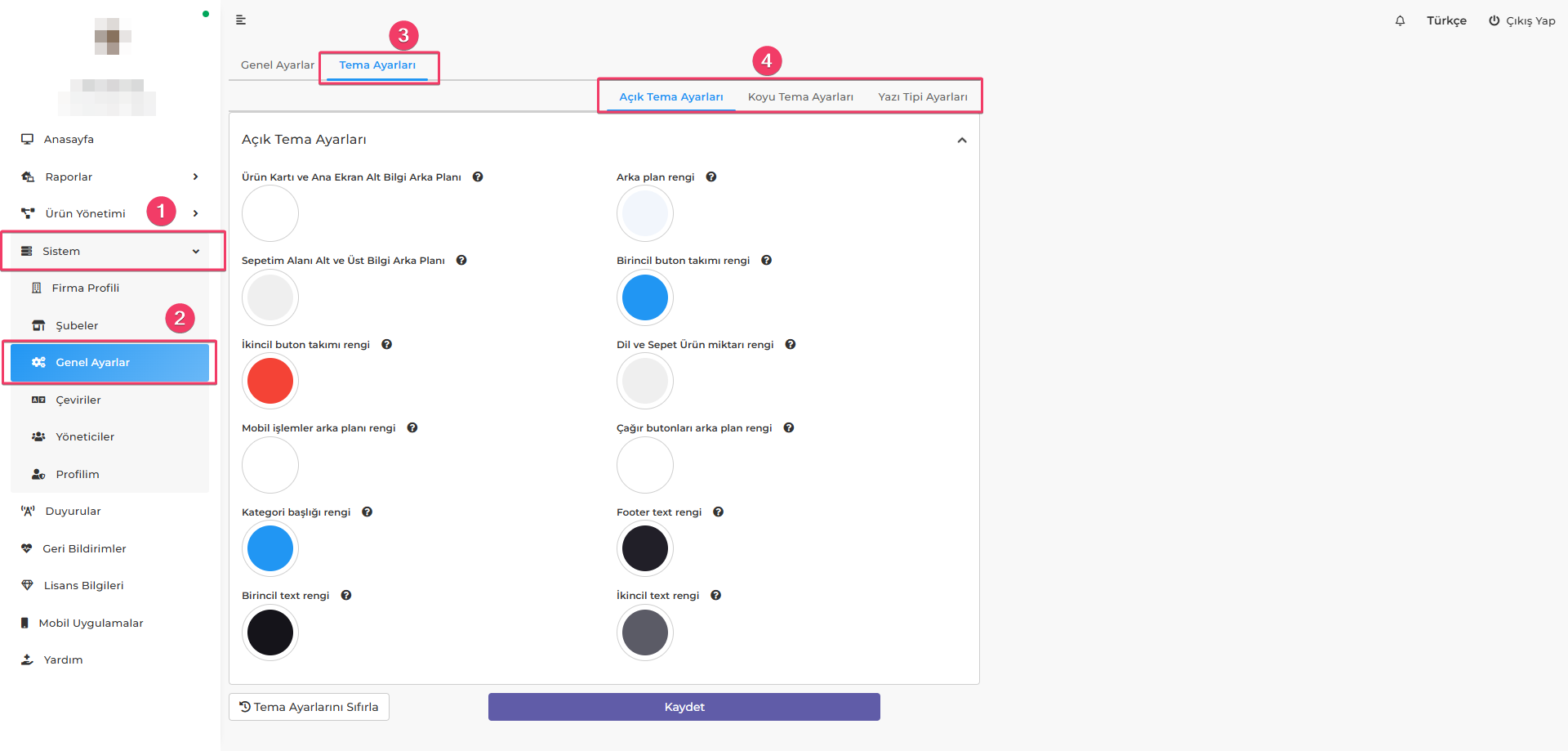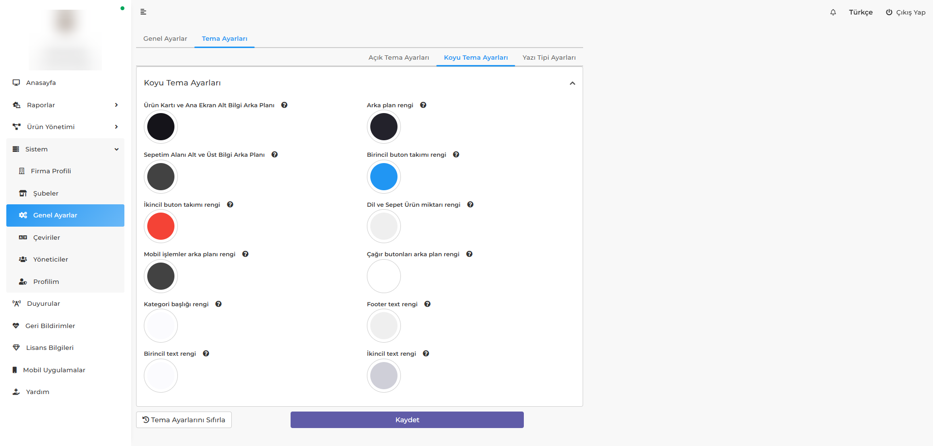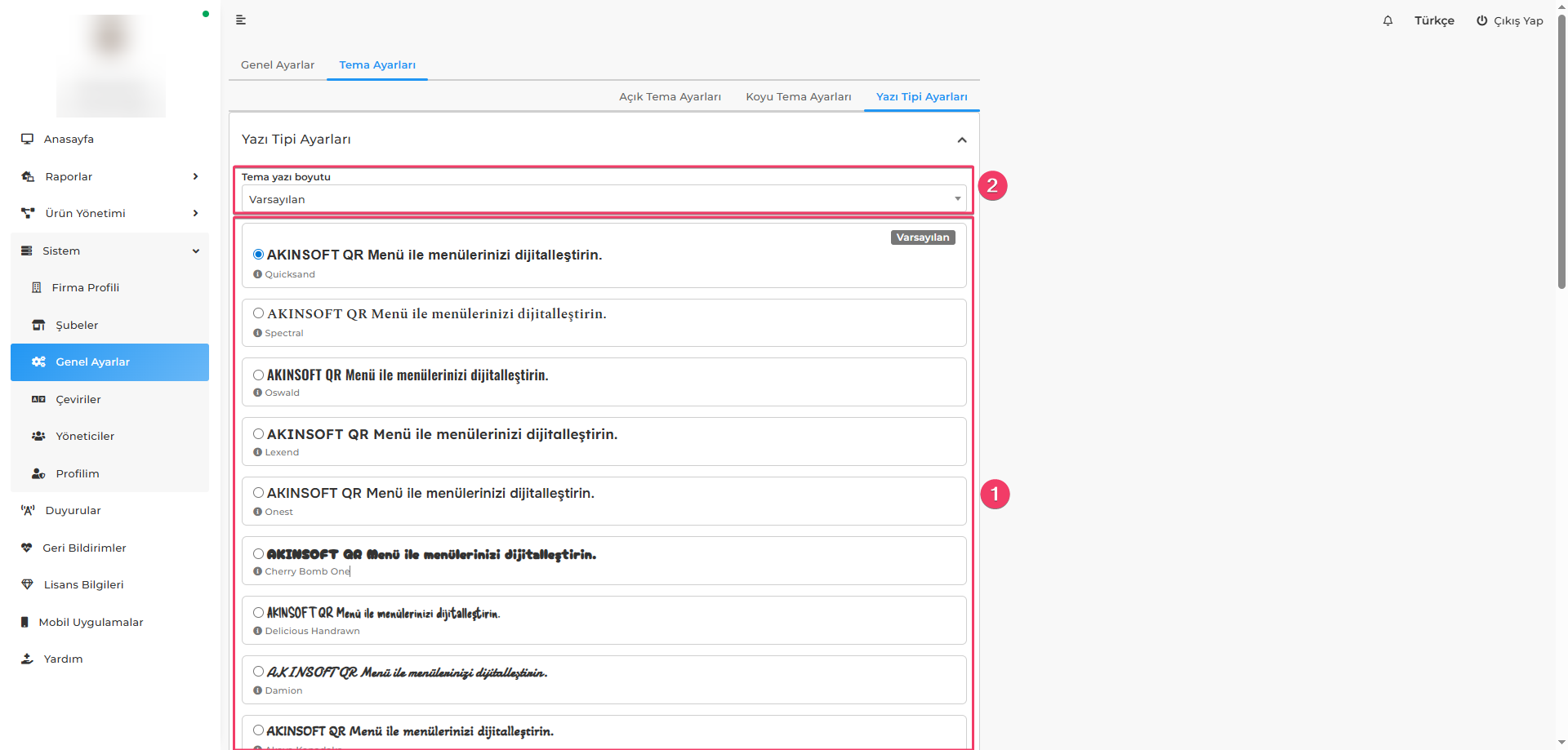 AKINSOFT QR Menü yönetim panelinizi açın. Açılan sayfadan Sistem - Genel Ayarlar - Tema Ayarları sayfasına gidin. Bu ekranda kurumsal kimliğinizi yansıtan renkleri açık tema ve koyu tema üzerinde ayrı ayrı seçebildiğiniz gibi yazı tipini de seçebilirsiniz.