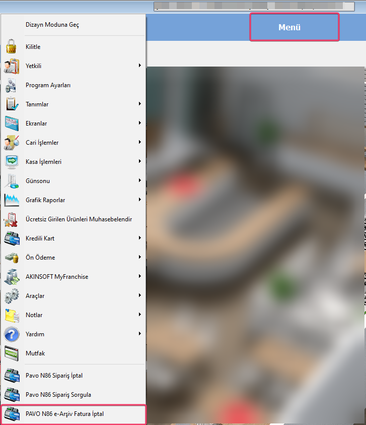 e-Arşiv Fatura İptal işlemi Cloud ve REST entegrasyonunda mümkündür. İptal işlemi için Menü ekranından PAVO N86 e-Arşiv Fatura İptal butonuna tıklayın.