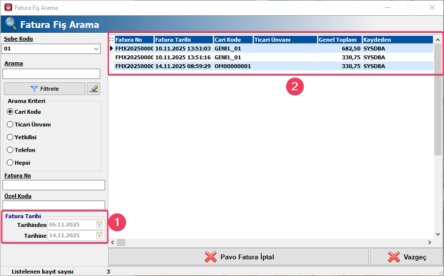 Açılan sayfada seçtiğiniz carinin son 1 aylık PAVO'ya gönderilmiş açık tutarı olan faturalarını göreceksiniz. Burada dilerseniz tarih filtresini değiştirip daha eski veya yeni kayıtların filtrelenmesini sağlayabilirsiniz. İlgili faturayı seçiniz.