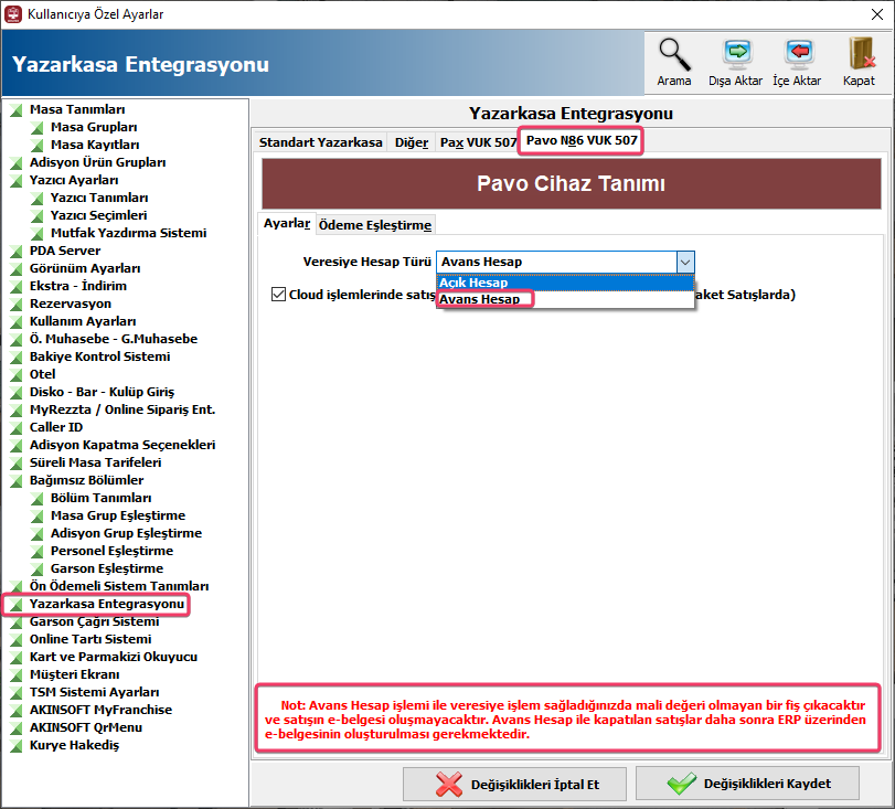Avans Hesap işlemi Cloud ve REST entegrasyonunda mümkündür. Avans Hesap işlemi için Menü-Program Ayarları-Yazarkasa Ayarları- PAVO N86 VUK 507 ekranından Veresiye Hesap Türü seçiminden Avans Hesap seçmeniz gerekmektedir. Bu ayar seçildiğinde yapılan veresiye işlemlerinde e-belge olumamaktadır. Bu işlemle yapılan satış daha sonra faturalanmak üzere bilgi ERP'de gönderilecek faturalar bölümünde görülmektedir. Avans Hesap türü ile hesap kapatabilmek istiyorsanız ‘Ödemesiz’ ödeme seçeneğini cihazınıza ekletmeniz gerekmektedir. Bunun için PAVO ile iletişime geçebilirsiniz.