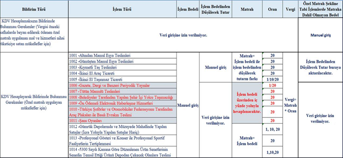 Özel Matrah Şekline Tabi İşlemlerin Tablo Kuralları