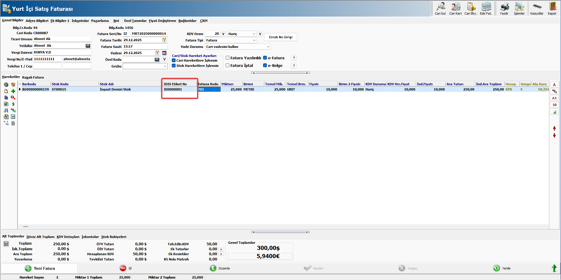 Fatura hareket satırında IDIS Etiket Numarası, İstisna faturası ise istisna kodu belirtilmesi zorunludur.