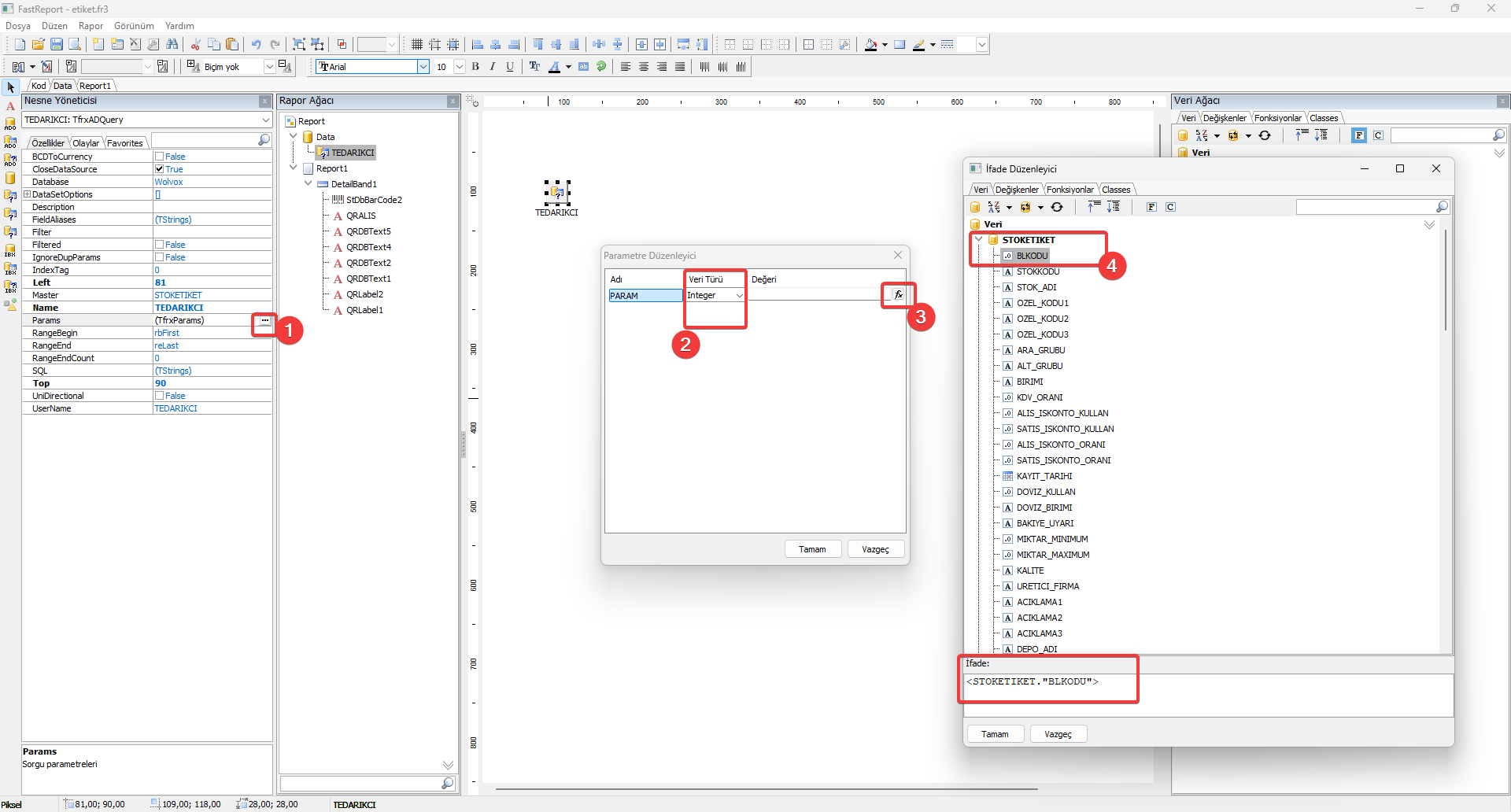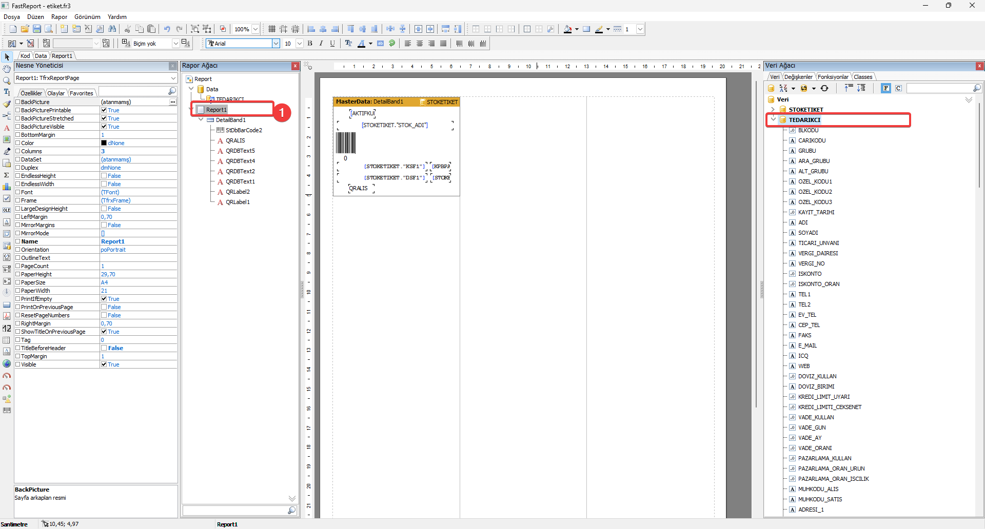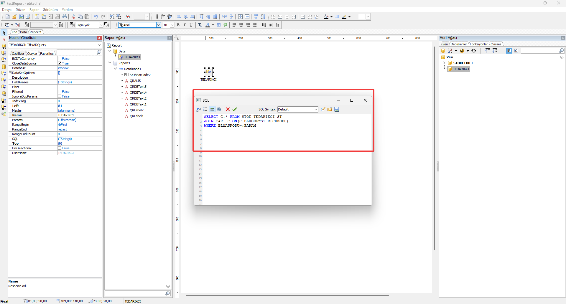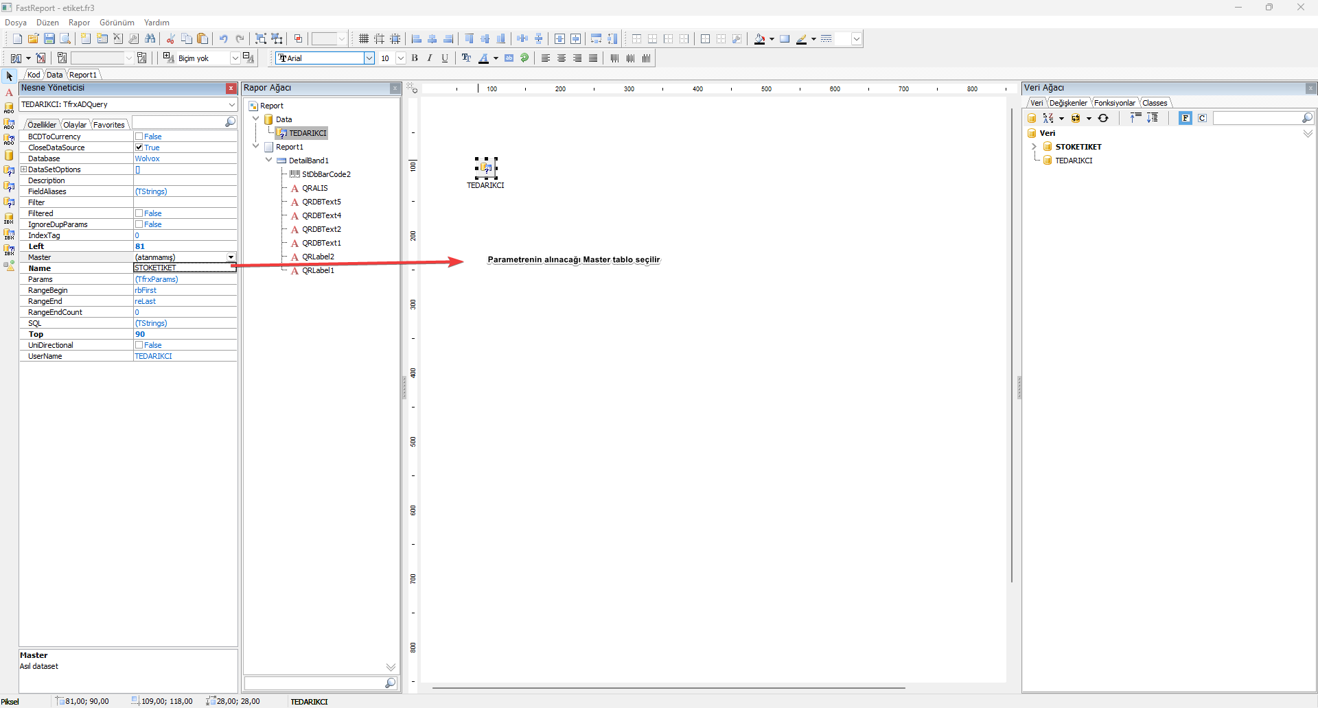 Son olarak parametreler de kaydedilir. Artık STOKETIKET tasarımında TEDARIKCI dataseti hazır bir şekilde bağlanmış durumdadır.