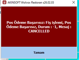 X30 tr entegrasyonunda Pos Ödeme başarısız:Fiş işlemi, Pos Ödeme Başarısız, Durum: -1, Mesaj: CANCELLED uyarısı almanız durumunda