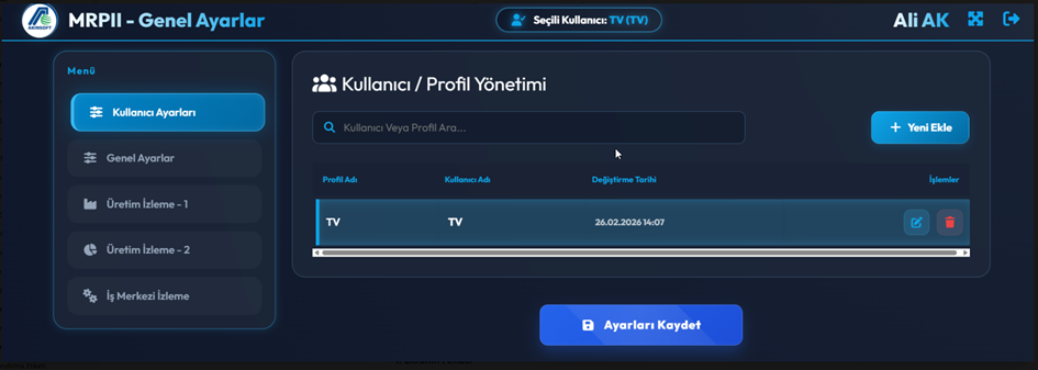 Bu ekran Üretim İzleme Sisteminde kullanıcı ve profil tanımlamalarının yapıldığı ayar ekranıdır. Sistem ekranlarının kimler tarafından kullanılacağı ve hangi profilin hangi ekranı göreceği bu bölümden belirlenir.