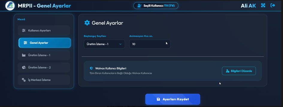 Bu bölüm Üretim İzleme Sisteminin Wolvox ERP sistemine bağlanacağı kullanıcıyı belirler. Sistem tüm üretim bilgilerini Wolvox ERP üzerinden alır.