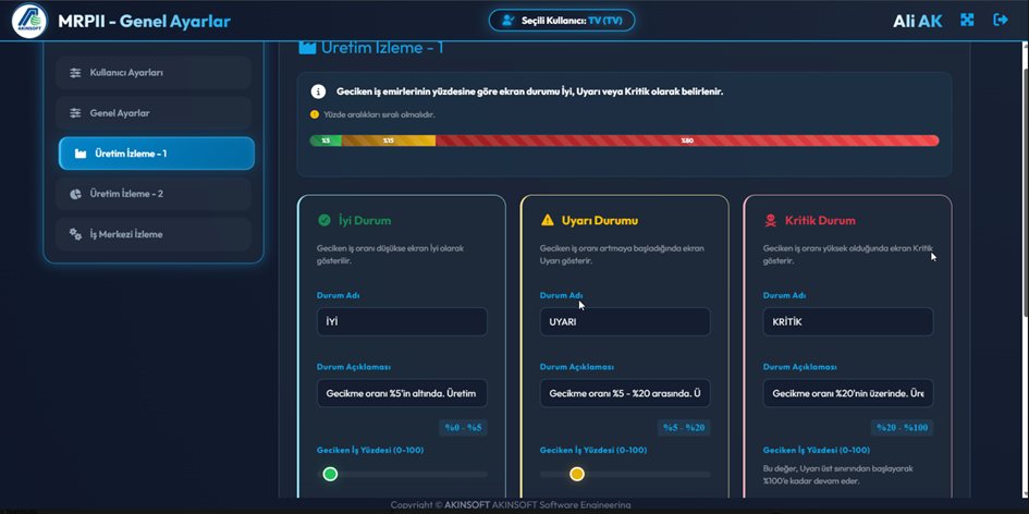 Bu ekran, Üretim İzleme – 1 ekranında gösterilecek üretim durumunun nasıl belirleneceğini tanımlamak için kullanılır. Sistem, geciken iş emirlerinin oranına göre ekran durumunu İyi, Uyarı veya Kritik olarak gösterir.