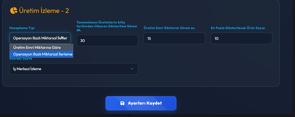 Bu ekran, Üretim İzleme – 2 ekranında gösterilecek üretim bilgilerinin nasıl hesaplanacağını ve nasıl görüntüleneceğini belirlemek için kullanılır. Üretim ilerleme hesaplama yöntemi, ekranda gösterilecek ürün sayısı ve ekran geçiş süreleri bu bölümden ayarlanır.