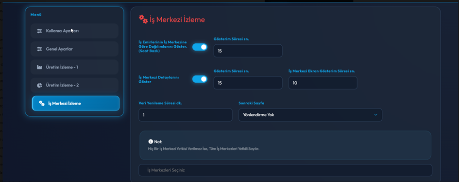 Bu ekran İş Merkezi İzleme ekranının nasıl çalışacağını belirlemek için kullanılır. İş merkezlerinin gösterim şekli, ekran süreleri ve veri yenileme aralıkları bu bölümden ayarlanır.