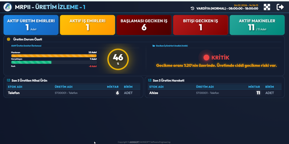 Bu ekranlar özellikle üretim yöneticileri ve üretim sorumlularının üretim durumunu hızlı şekilde değerlendirebilmesi amacıyla tasarlanmıştır.