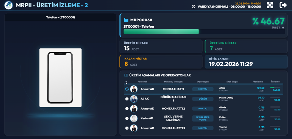 Bu ekran aktif üretim emirlerinin detaylı ilerleme durumunu göstermek için kullanılır. Üretim emrinin ne kadar tamamlandığı, hangi operasyonların yapıldığı ve ne kadar üretim kaldığı bu ekrandan izlenir. Bu ekran özellikle üretim sorumluları ve planlama birimi için detaylı takip ekranıdır.