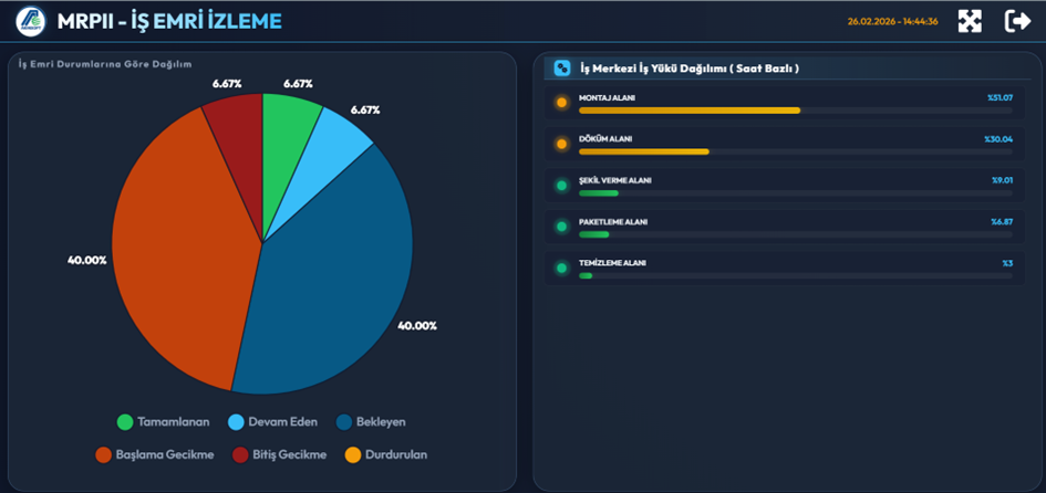 Bu ekran iş emirlerinin durumunu ve iş merkezlerinin yük dağılımını göstermek için kullanılır. Üretim işlerinin hangi aşamada olduğu ve iş merkezlerinin ne kadar yoğun çalıştığı bu ekrandan izlenebilir. Bu ekran özellikle planlama ve üretim yönetimi için karar destek ekranıdır.